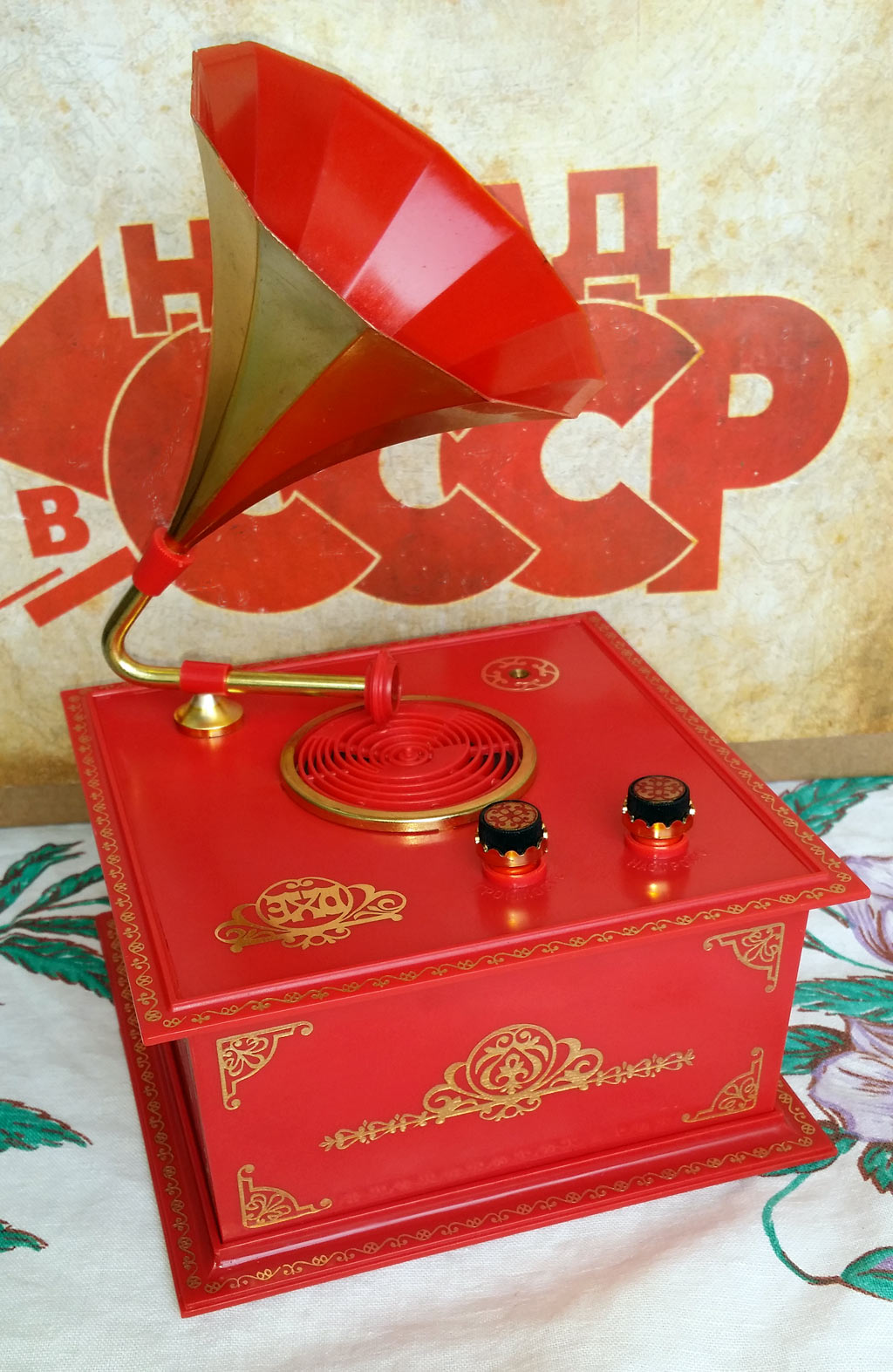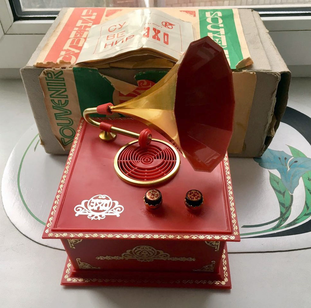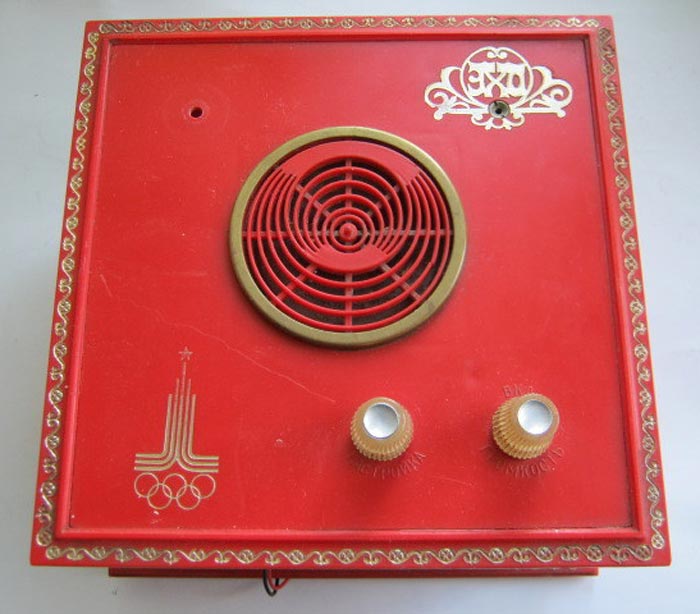 Сувенирный радиоприёмник *Эхо* с 1976 года выпускал Московский радиотехнический завод. Радиоприёмник собран на семи транзисторах по схеме прямого усиления и выпускался в нескольких вариантах оформления. Приёмник работает в диапазоне СВ (186,9...541,4 м) и питается от двух батарей *3336Л*. Включение приёмника (до 1978 года) происходило вращением рупора к краю **диска**, затем регулятором громкости совмещённым с выключателем. С 1978 года завод выпускал приёмник *Эхо-2* с более современной элементной базой и немного изменённой схемой и конструкцией. С 1979 года завод выпускал приёмник *Эхо-Олимпийский* аналогичный модели *Эхо-2*. Цена моделей: 13 рублей 90 копеек (Эхо-2), 19 рублей 70 копеек (Эхо) и 24 рубля (Эхо-Олимпийский). Олимпийский вариант часто именовался просто *Эхо*.