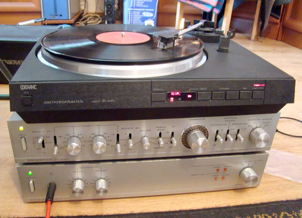 Электропроигрыватель *Феникс ЭП-009-стерео* с начала 1986 года выпускал Львовский завод телеграфной аппаратуры. Стереофонический электропроигрыватель высшей группы сложности **Феникс ЭП-009-стерео** имеет 2-х скоростное ЭПУ с прямым приводом и предназначен для высококачественного воспроизведения стерео и монофонических записей с грампластинок. Он может работать с усилителем звуковой частоты любого типа имеющий вход для подключения магнитоэлектрического звукоснимателя. В модели установлена магнитоэлектрическая головка ГЗМ-055, с алмазной иглой, обеспечивающая высокое качество воспроизведения и минимальный износ пластинок. Для устранения влияния скатывающей силы тонарм имеет устройство компенсации. ЭП имеет устройство автоматической установки иглы звукоснимателя на вводную канавку грампластинки и возврат тонарма на стойку после окончания проигрывания. В модели применены: микропроцессорное управление с записью логики работы в ПЗУ, автостоп, микролифт, регулятор прижимной силы, устройство компенсации скатывающей силы, неотключаемая кварцевая стабилизация частоты вращения диска, автоматическая установка тонарма на вводные канавки всех стандартных грампластинок, возвращение тонарма в исходное положение, многократное проигрывание пластинки, ручного управления перемещением тонарма с квазисенсорной панели управления при закрытой крышке аппарата. Напряжение питания 220 В. Частота вращения диска 33, 45, об/мин. Коэффициент детонации ЭПУ - 0,05%. Отношение сигнал/рокот со взвешивающим фильтром - 76 дБ. Отношение сигнал/фон - 70 дБ. Диапазон регулирования прижимной силы 0...20 мН. Потребляемая мощность 15 Вт. Габариты проигрывателя - 430x130x370 мм. Масса 7 кг.