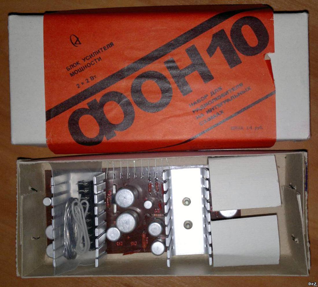 Радиоконструктор *Фон-10* с I-кв 1989 года выпускал Московский завод *Эллинг*. Блок стереофонического усилителя мощности выполнен в виде набора и предназначен для самостоятельного конструирования и модернизации радиоаппаратуры. Усилитель может работать с любой АС, имеющей сопротивление не менее 4 Ом. Блок является функционально законченным узлом, собранным с использованием линейных ИС серии К174, в виде модуля. Номинальная выходная мощность - 2х2 Вт. Диапазон усиливаемых частот - 40....20000 Гц. Чувствительность усилителя 0,25 В. Коэффициент гармоник 1%. Напряжение питания 15 В. Используя набор *Фон-10* совместно с наборами Фон-6, 7, 8, 9, 11 можно собрать высококачественный стереофонический УКВ-ЧМ приёмник.