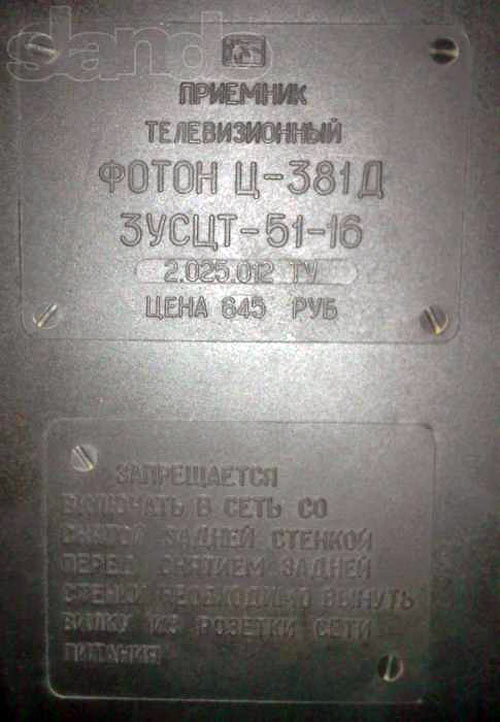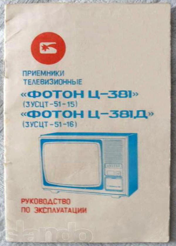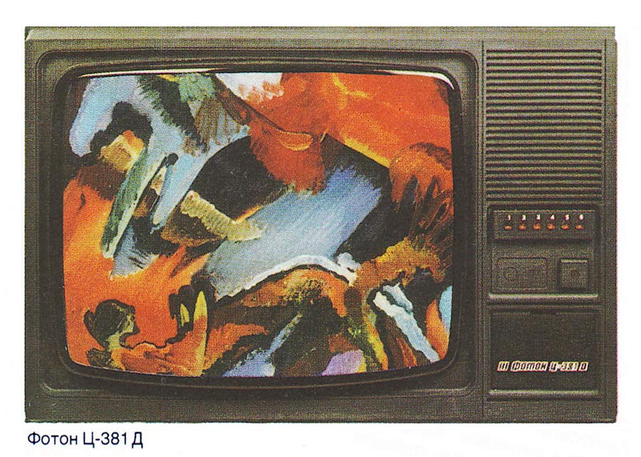 Телевизионный приёмник цветного изображения *Фотон Ц-381/Д* с 1986 года выпускал Симферопольский завод телевизоров им. 50-летия СССР. Унифицированный стационарный цветной телевизор третьего класса **Фотон Ц-381Д** (ЗУСЦТ-П-51-6) рассчитан на приём телепередач цветного и чёрно-белого изображения в МВ и ДМВ. Телевизор собран на полупроводниковых приборах и интегральных микросхемах. Коммутация программ электронная, со светодиодной индикацией ТВ канала. В модели применён взрывозащищенный кинескоп типа 51ЛК2Ц с самосведением и углом отклонения лучей в 90°. В его акустической системе установлен громкоговоритель 3ГД-38. Размеры экрана 203х404 мм. Чувствительность тракта изображения, ограниченная синхронизацией в МВ 55 мкВ, ДМВ 90 мкВ. Чёткость ч/б изображения в центре экрана; по горизонтали 450, вертикали 500 линий. Номинальная выходная мощность 1 Вт. Диапазон звуковых частот 100...10000 гц. Размеры телевизора - 640х470х445 мм. Масса 17 кг.