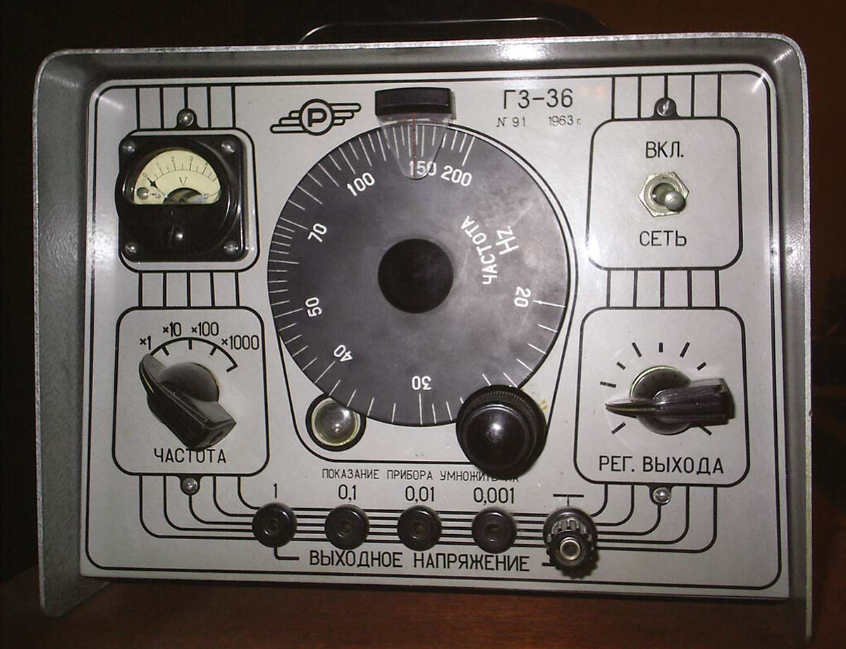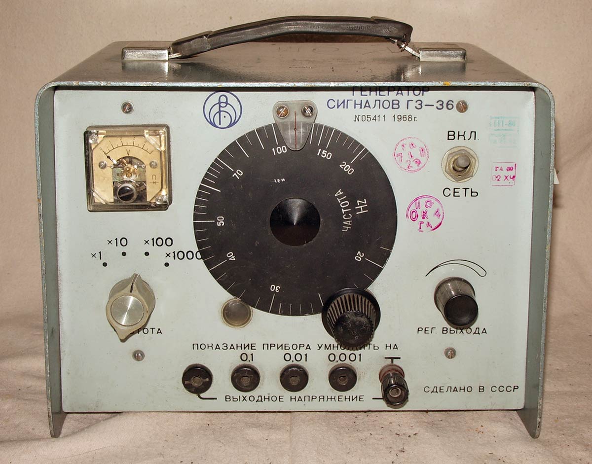 Генератор сигналов низкочастотный *Г3-36* выпускался с 1963 года Великолукским радиозаводом. Генератор *Г3-36* представляет собой портативный источник синусоидальных электрических колебаний звуковых и ультразвуковых частот. Генератор предназначен для, настройки, регулировки и испытания НЧ каскадов радиоаппаратуры в лабораторных и производственных условиях. Имеется регулировка выходного напряжения, контролируемая индикатором. Диапазон частот 20...200000 Гц. Выходное напряжение на нагрузке 600 Ом до 5 В. Коэффициент гармоник 2%. Питание от сети. Потребляемая мощность 7 Вт. Габариты прибора 260х230х165 мм. Масса 5 кг. В 1967 году генератор претерпел 1-ю модернизацию, а в конце 70-х вторую, после чего генератор стал именоваться как *Г3-36А*.
