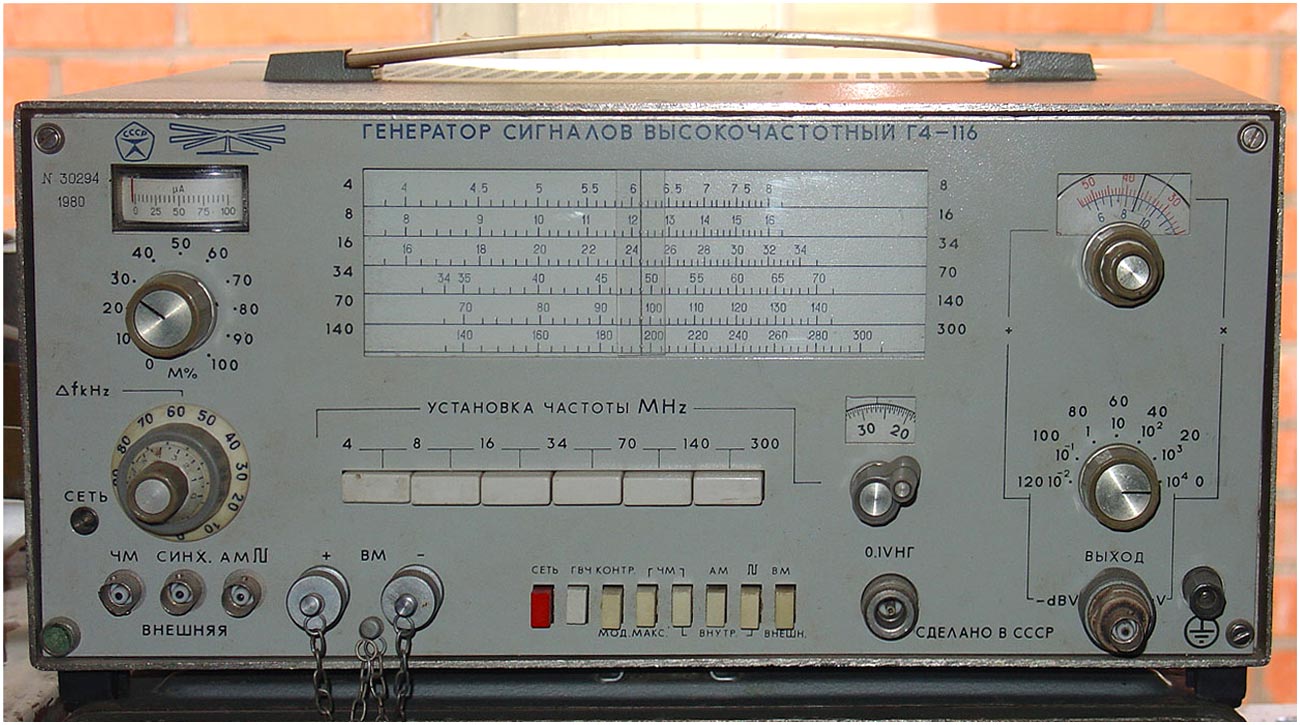 Генератор сигналов высокочастотный *Г4-116* выпускался с 1980 года. Он предназначен для настройки, регулировки и контроля приёмной аппаратуры МВ и ДМВ диапазонов. Генератор обеспечивает измерение электрических характеристик и параметров радиоприёмниых устройств, работающих в режимах непрерывной генерации, амплитудной модуляции, частотной модуляции и модуляции видеосигналом. Диапазон рабочих частот генератора от 4 до 300 МГц, разбит на 6 поддиапазонов; 4...8, 8...16, 16...34, 34...70, 70...140 и 140...300 МГц. Основная погрешность установки необходимой частоты - 1%.
