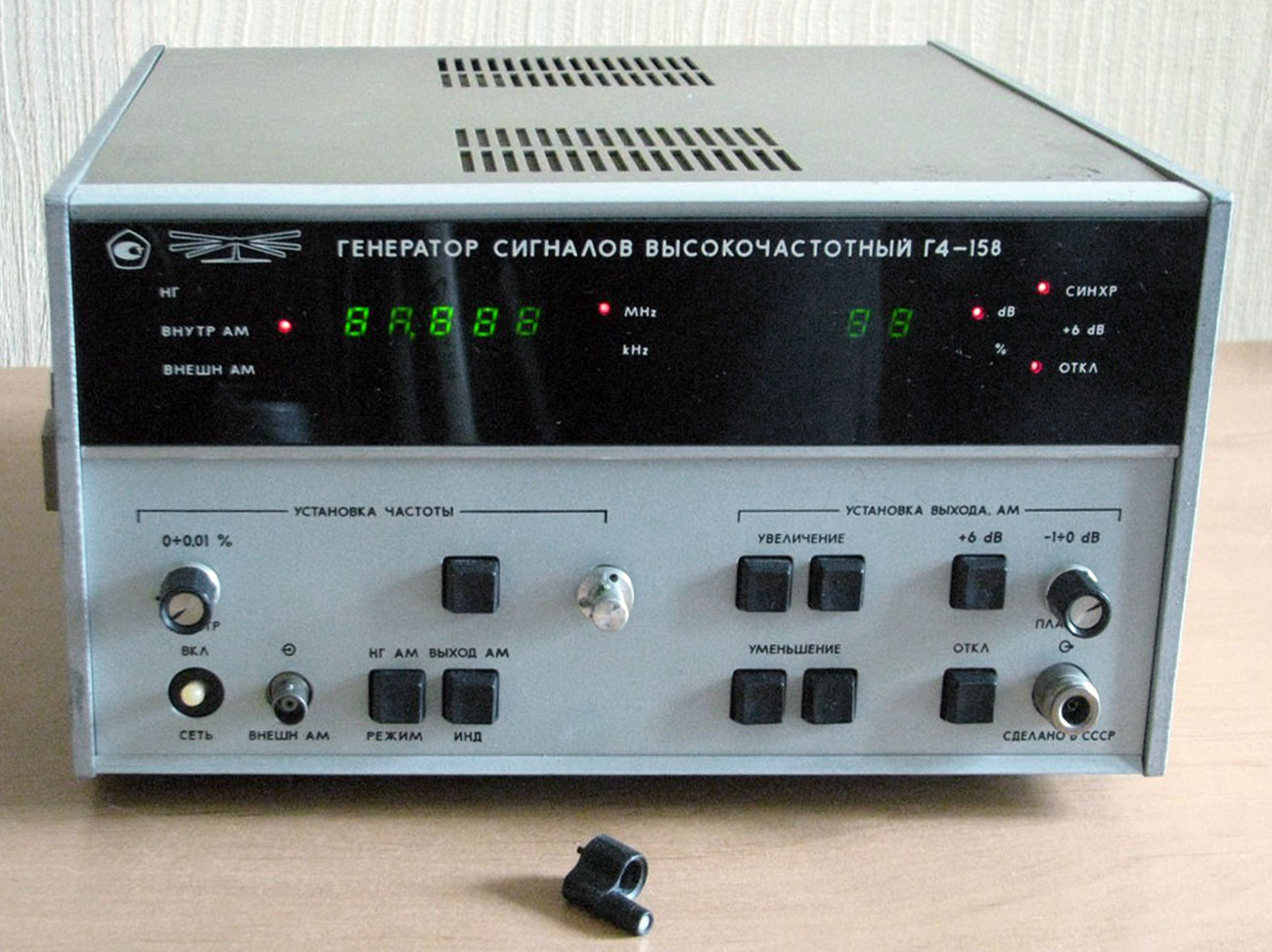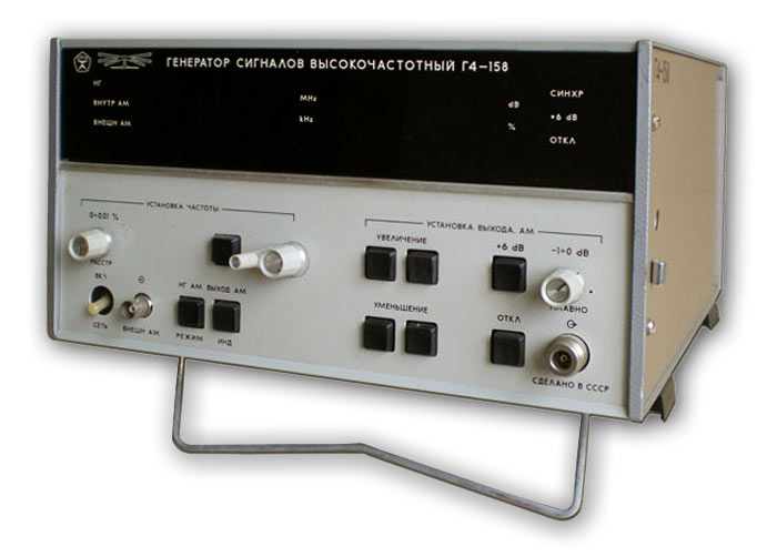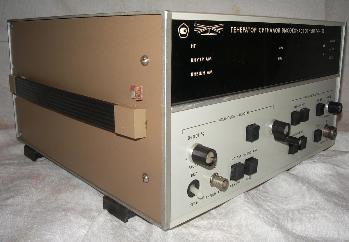 Генератор высокочастотный *Г4-158* с 1988 года выпускал Нижегородский завод им. М.В.Фрунзе. Диапазон частот 10 КГц...100 МГц разбит на 4 поддиапазона: 10...100 КГц, 100 КГц...1 МГц, 1...10 МГц, 10...100 МГц. Прибор имеет дистанционное управление. Габариты генератора 340х175х415 мм. Масса 10,5 кг.