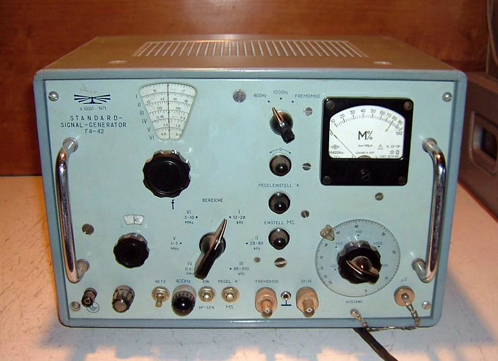 Генератор высокочастотных сигналов *Г4-42* выпускался с 1970 года. Генератор высокочастотных сигналов *Г4-42* предназначен для проверки и настройки электронной аппаратуры. Диапазон частот - 120 КГц...10 МГц. Выходное калиброванное напряжение регулируемое от 0,1 мкВ до 110 мВ. Напряжение питания 220 В, 50Гц; 115В, 400Гц. Потребляемая мощность 100 Вт. Габаритные размеры генератора 388х289х285 мм. Масса 18 кг.