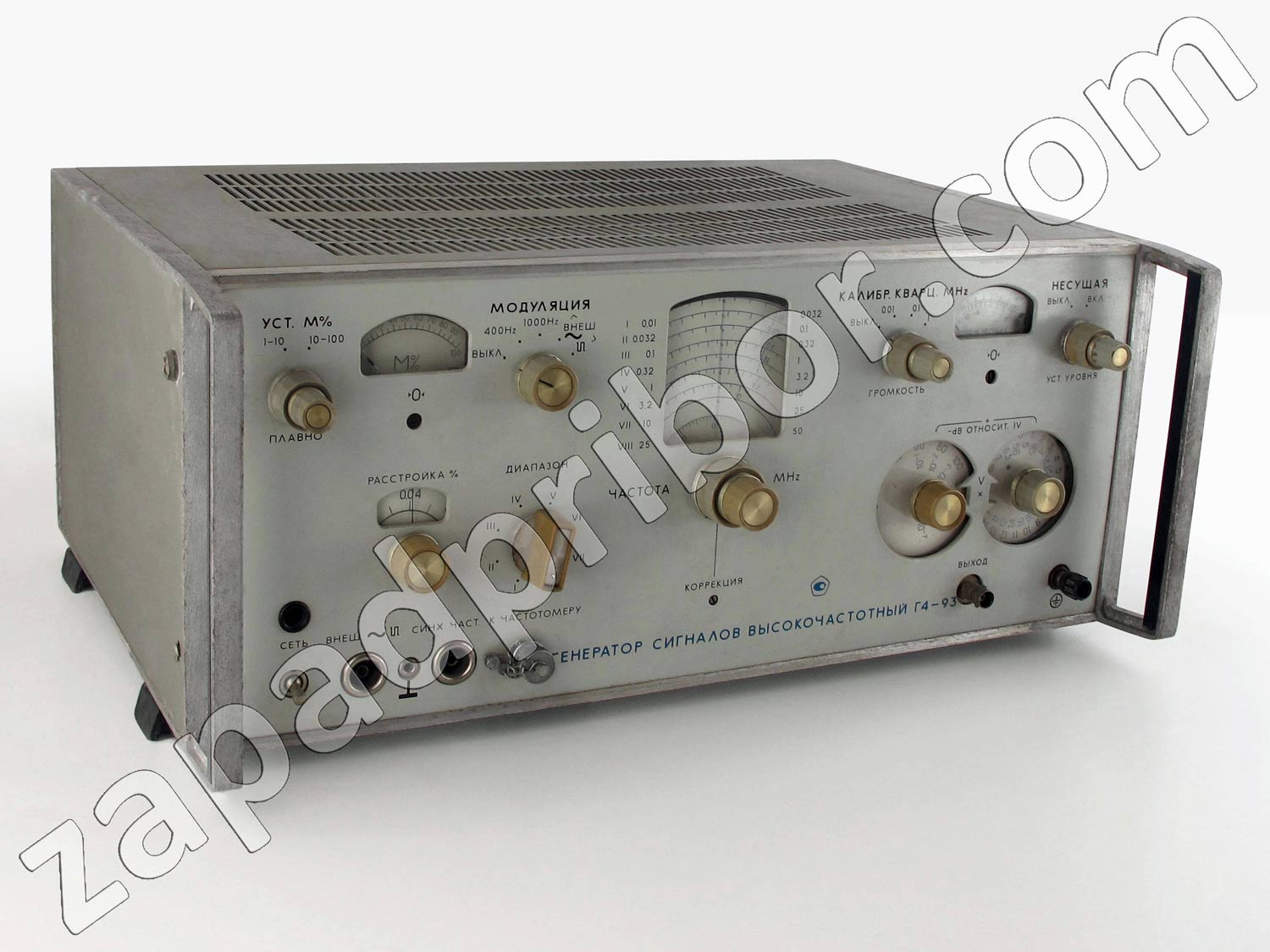 Генератор сигналов *Г4-93* выпускался с начала 1972 года. Предназначен для контроля, проверки и настройки различной приёмо-передающей аппаратуры работающей в диапазоне от 30 КГц до 40 МГц (реально от 100 КГц д 50 МГц. Подробнее в рекламном описании журнала Радио.