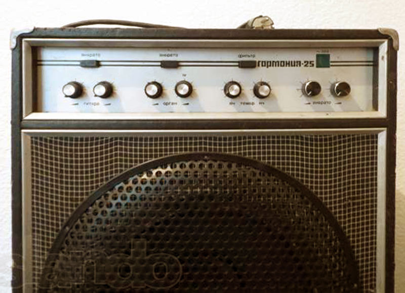 Транзисторный усилитель *Гармония-25* с акустической системой с 1984 года выпускали в Уфе, на А/я 37. Высококачественный усилитель НЧ с АС *Гармония-25* с высоким акустическим КПД предназначен для усиления электрических сигналов с ЭМИ и их воспроизведение высококачественным акустическим агрегатом. Технические параметры установки. Номинальная выходная мощность усилителя 12 Вт, максимальная 25 Вт. Коэффициент нелинейных искажений не более 1%. Диапазон рабочих частот усилителя 30...2000 Гц, акустической системы по звуковому давлению 80...14000 Гц. Среднее звуковое давление 0,4 Па. В усилителе имеются плавные регуляторы тембра по НЧ и ВЧ частотам. Питается усилитель от сети 220 В. Потребляемая максимальная мощность 100 ВА. Габариты усилителя с АС 1100х500х250 мм. Его масса 35 кг. Цена 525 рублей.