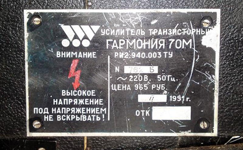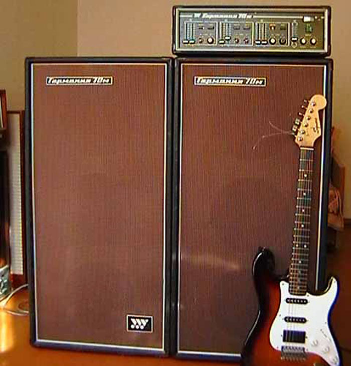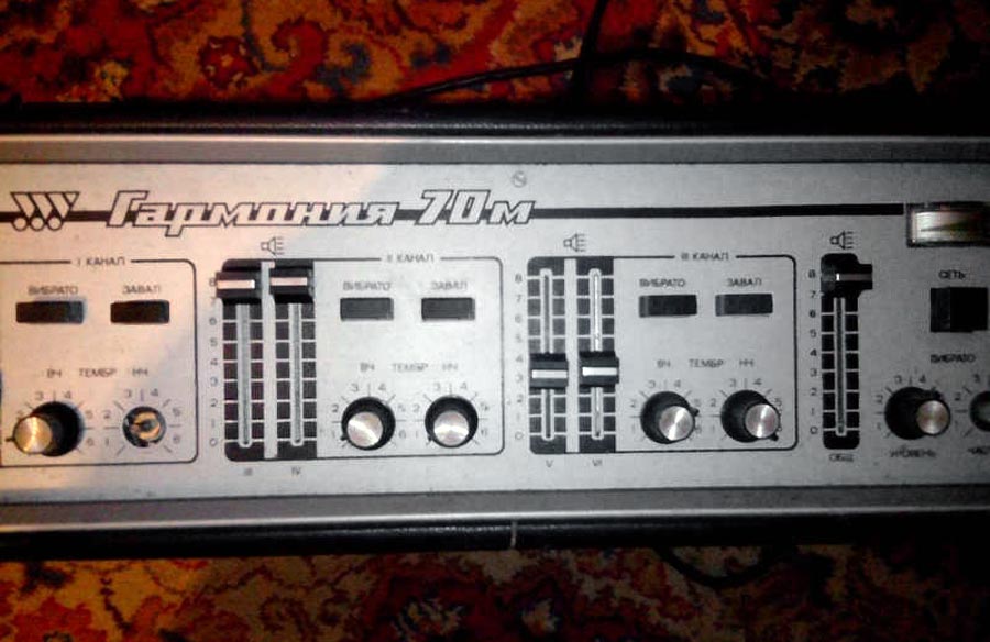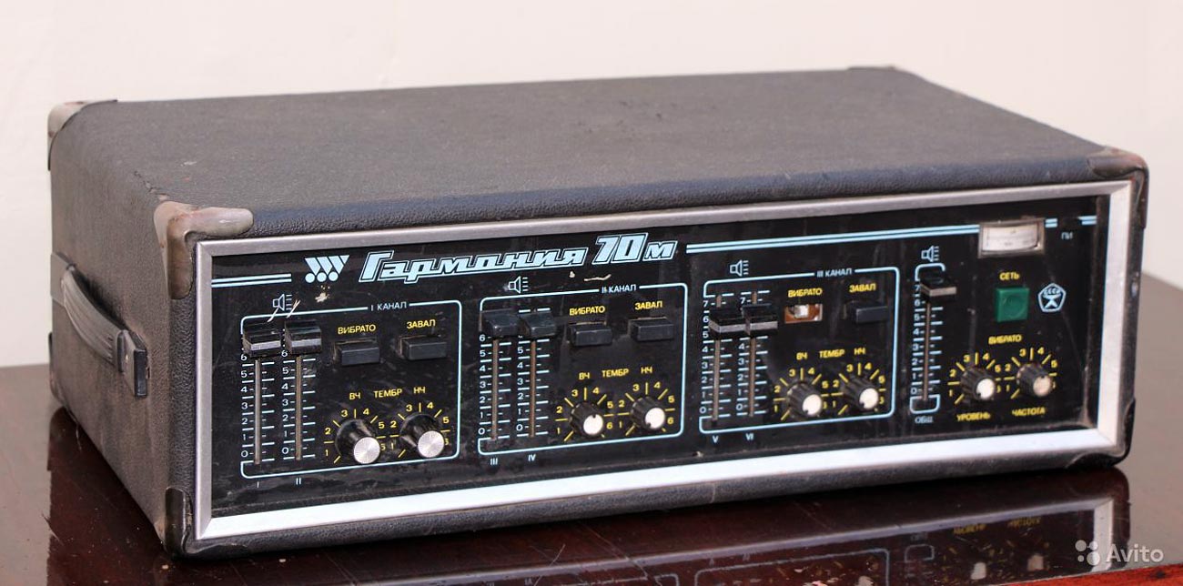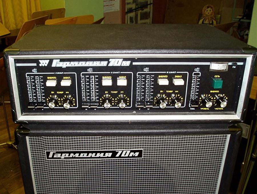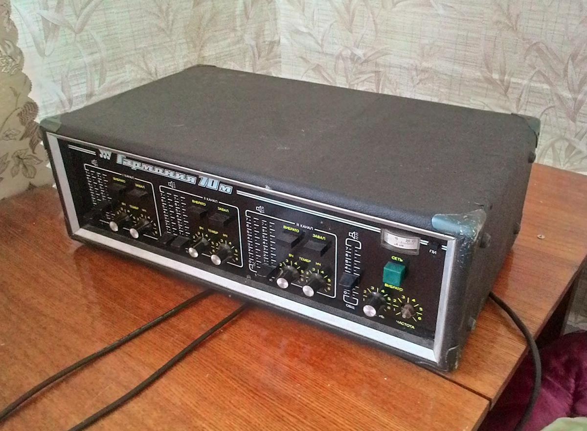 Эстрадный усилитель с АС *Гармония-70М* выпускался с 1985 года. Он предназначен для озвучивания средних залов, вмещающих примерно 200 человек. Состоит из УКУ и двух одноимённых АС. Усилитель обеспечивает высококачественное усиление сигналов от электронных музыкальных инструментов (ритм-гитары, соло-гитары, органа) и микрофонов. В усилителе предусмотренны: 6 входов под разные типы источников сигнала. Отключаемая стрелочная индикация уровня сигнала и перегрузки. Регуляторы режима **вибрато** по глубине и частоте. Кнопки включения режима **вибрато**, снижения громкости на 10 дБ, регулировки ВЧ и НЧ для каждой из трёх групп входов. Регулировка громкости каждого входа. Общая регулировка уровня громкости. Имеется два выхода на АС. Характеристики усилителя: Номинальная выходная мощность 35 Вт, максимальная долговременная мощность 70 Вт, максимальная кратковременная мощность 150 Вт. Диапазон рабочих звуковых частот 20...20000 Гц. Коэффициент гармоник 0,3%. Характеристики аккустических систем: Номинальная мощность 35 Вт. Диапазон воспроизводимых частот: 63...14000Гц. Сопротивление 6 Ом. Усилитель выпускался в нескольких вариантах оформления, несколько раз модернизировался, поэтому некоторые партии отличались от базового несколько другими техническими параметрами.