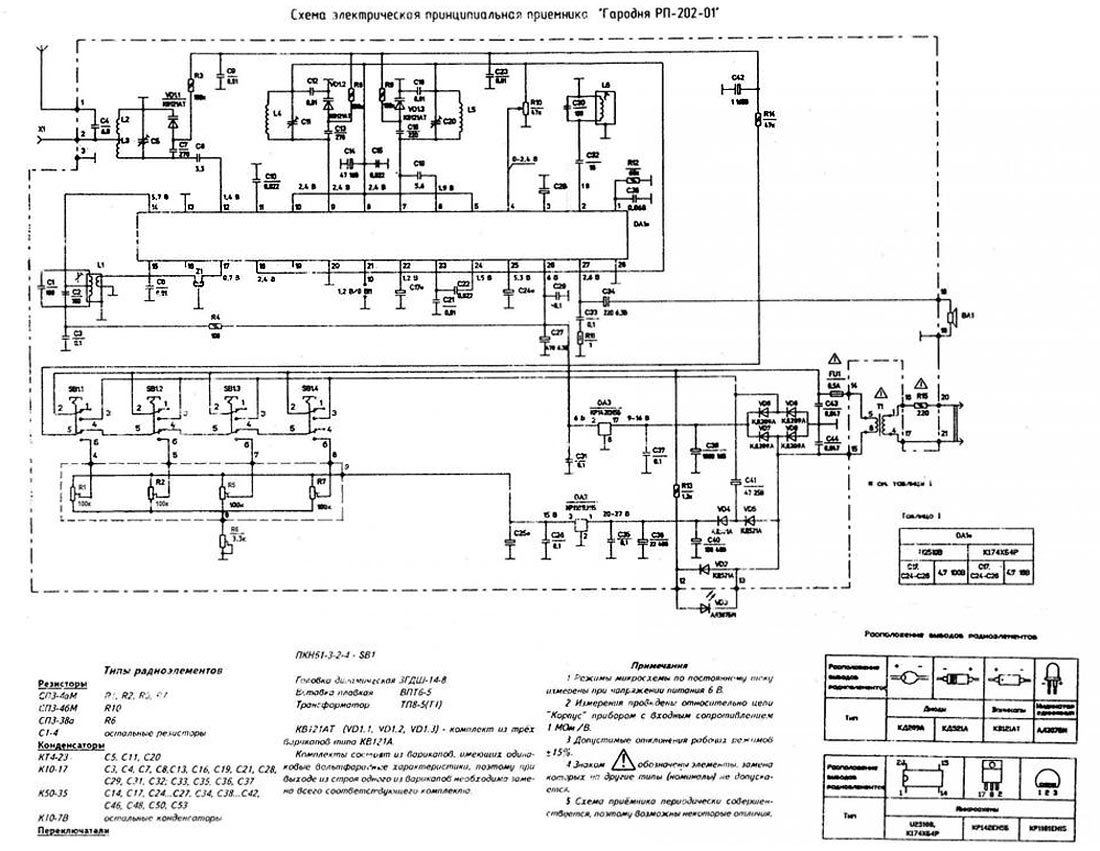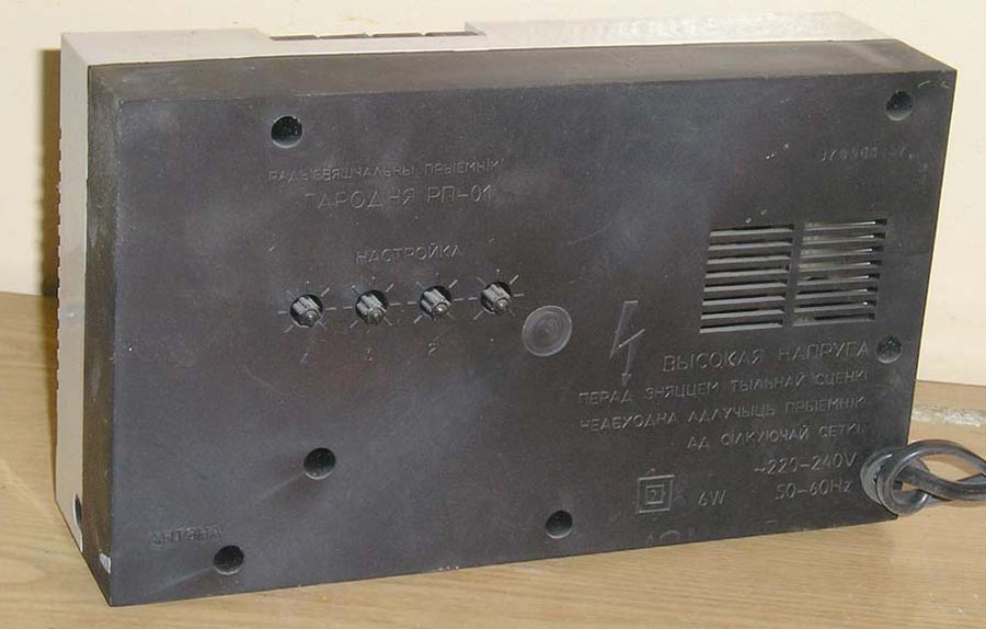 Стационарный транзисторный радиоприёмник *Гародня РП-202-01* с 1994 года выпускало Гродненское ПО *Волна*. Радиоприёмник рассчитан на приём радиовещательных станций в двух УКВ диапазонах 65...74 МГц и 87,5...108 МГц. Радиоприёмник имеет четыре фиксированные настройки на заранее настроенные частоты радиовещательных станций в любом диапазоне. Антенна - отрезок провода длиной около метра. Радиоприёмник имеет чувствительность 10 мкВ. Номинальная выходная мощность 1 Вт. Диапазон воспроизводимых частот 150...10000 Гц. Питание от сети 220 В. Электрическая схема и соответственно монтаж на платах имели два варианта исполнения, на микросхеме и на рассыпухе (на фото 6 - 2 вариант).