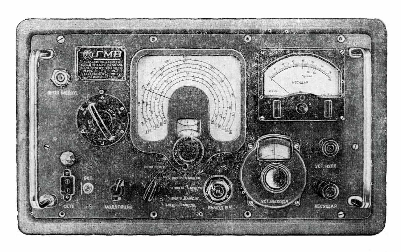 Генератор метровых волн *ГМВ* выпускался с 1955 года. Прибор *ГМВ* предназначен для проверки и настройки радиоприёмной аппаратуры УКВ диапазона, а также для проверки и настройки ВЧ и ПЧ трактов телевизоров. Прибор работает в диапазоне частот от 20 до 400 МГц. Максимальная погрешность установки частоты 1,5%. Генератор работает в следующих режимах: непрерывная генерация; внутренняя амплитудная модуляция синусоидальным напряжением с частотой 1000 Гц; внешняя амплитудная модуляция синусоидальным напряжением с частотами от 60 до 8000 Гц; внутренняя амплитудная модуляция прямоугольными импульсами длительностью около 2 микросекунд с частотой повторения 1000 Гц; внешняя модуляция прямоугольными импульсами длительностью от 4 до 20 микросекунд: при частоте повторения от 200 до 3000 Гц. Выход прибора *ГМВ* рассчитан на подключение коаксиального кабеля с волновым сопротивлением 75 Ом, на конце которого выходное напряжение может изменяться в пределах от 4 мкВ до 50 мВ. К прибору придается внешний делитель, уменьшающий выходное напряжение в 10 раз. Погрешность калибровки выходного напряжения в режиме непрерывной генерации на частоте 40 МГц не более 10%. Максимальная погрешность калибровки выходного напряжения в импульсном режиме 30%. Питание прибора осуществляется от сети переменного тока частоты 50 гц, напряжением 127 или 220 В.