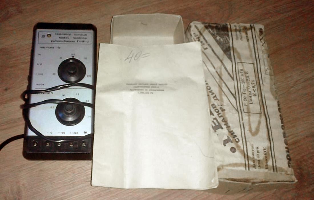 Генератор сигналов низкой частоты *ГНЧР-2* выпускался с 1988 года. Генератор *ГНЧР-2* (Генератор Низкой Частоты Радиолюбителя 2-й вариат) имеет небольшие габариты и массу (200х60х92 мм, 500 г) и современный внешний вид. Он выполнен на операционном усилителе КР140УД1Б по классической схеме с мостом Вина. Для улучшения нагрузочных характеристик в него введен эмиттерный повторитель на транзисторе КТ602Б. Стабилизацию амплитуды обеспечивает термистор ТПМ-2/0,5А. Диапазон генерируемых частот от 20 Гц до 200 кГц разбит на четыре поддиапазона. Точность установки частоты 1 кГц не хуже 10% (на остальных частотах она не нормируется). Максимальная амплитуда выходного сигнала на нагрузке 1 кОм не менее 2,5 В. Уровень выходного сигнала можно регулировать плавно и ступенями (уменьшать в 10, 100 и 1000 раз). Погрешность ступенчатых делителей не превышает соответственно 10, 15 и 25%. Коэффициент гармоник не более 0,7%. Генератор питается от сети переменного тока напряжением 220 В через встроенный выпрямитель. Потребляемая мощность не превышает 6,6 Вт. Цена генератора 40 рублей.
