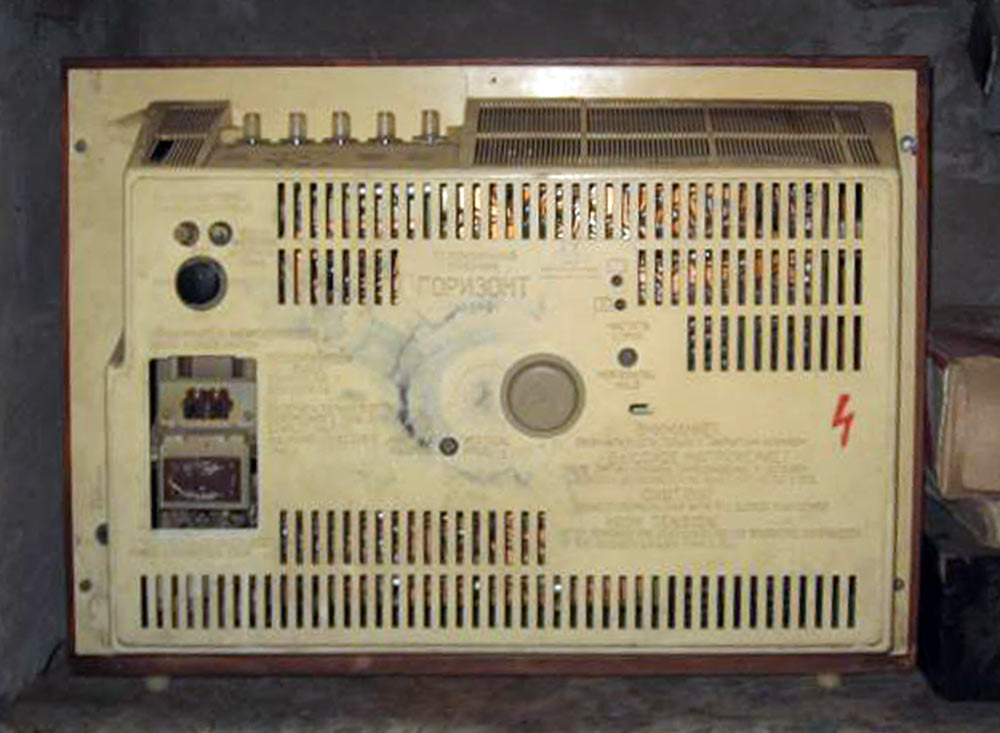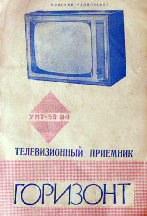 Телевизор ч/б изображения *Горизонт* с 1968 года выпускал Минский радиозавод имени 50-летия КПБ и Минский радиозавод имени В. И. Ленина. Ламповый унифицированный телевизор второго класса **Горизонт** (УНТ-59-II-1) предназначен для приёма програм на любом из 12 стандартных телевизионных каналов. Телевизор имеет 17 радиоламп, 22 диода и кинескоп типа 59ЛК2Б с размером экрана 385 х 489 мм. Модель выпускали в настольном и настольно-напольном вариантах (с ножками в комплекте), с различной отделкой футляра и передней панели. Аппарат отвечает всем техническим характеристикам для унифицированных телевизоров этого типа. Чувствительность по каналу изображения со входа антенны 50 мкВ. Номинальная выходная мощность 1,5 Вт. Частотная характеристика по звуковому воспроизведению - 100...10000 Гц. Габариты телевизора 525 х 700 х 430 мм, масса 36 кг. Потребляемая от электрической сети 110, 127 или 220 В мощность не превышает 180 Вт.