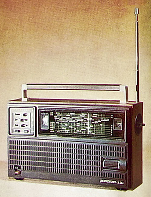 Радиоприёмник *Горизонт-220* в 1980 году опытно выпустил Минский радиозавод. Переносной радиоприёмник 2-го класса **Горизонт-220** рассчитан на работу в ДВ, СВ, пяти растянутых KB и УКВ диапазонах. Модель имеет раздельную регулировку тембра по ВЧ и НЧ, регуляторы ползункового типа, индикатор настройки, автоматическую подстройку частоты в УКВ диапазоне. Питание универсальное: 6 элементов 373 или сеть переменного тока через встроенный БП. Имеется выход сигнала для записи на магнитофон, подсветка шкалы. Телескопическая антенна фиксируется в любом положении. Полоса воспроизводимых частот по звуковому давлению в диапазонах ДВ, СВ и КВ - 125...4000 Гц, на УКВ-ЧМ - 125..10000 Гц. Номинальная выходная мощность 0,5, максимальная 1,5 Вт. Габариты приёмника - 360х250х120 мм. Его вес 4,4 кг. Всего заводом было выпущено около 30 радиоприёмников.