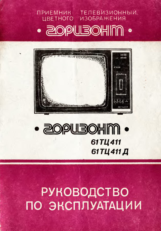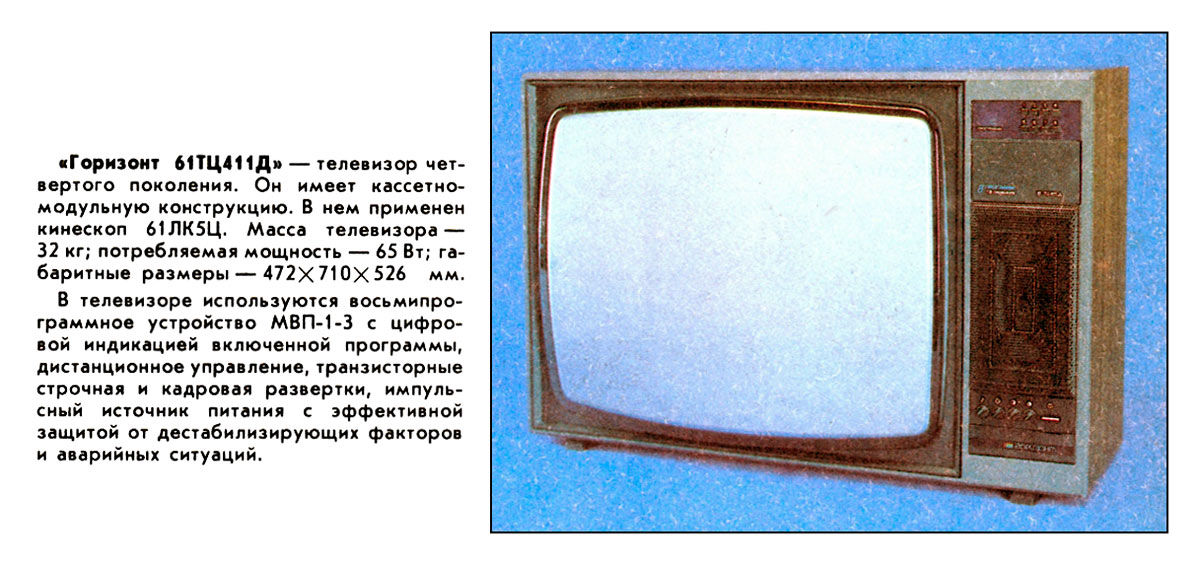 Телевизионный приёмник цветного изображения *Горизонт 61ТЦ-411/Д* с 1988 года выпускало Минское ПО *Горизонт*. Унифицированный цветной телевизор 4-го поколения **Горизонт 61ТЦ-411/Д** имеет кассетно-модульную конструкцию и собран на интегральных микросхемах и полупроводниковых приборах. В модели применён кинескоп типа 61ЛК5Ц-1 с размером диагонали экрана 61 см и видимым изображением размером 362 х 482 мм. В моделях используются 8-программное устройство типа МВП-1-3 с цифровой индикацией включенной программы, дистанционное управление (ПДУ), транзисторные строчная и кадровая развертки, импульсный источник питания, с эффективной защитой от дестабилизирующих факторов и аварийных ситуаций. Чувствительность моделей по каналу изображения в МВ диапазоне 40, ДМВ 70 мкВ. Номинальная выходная мощность канала звукового сопровождения - 2,5 Вт. Диапазон воспроизводимых звуковых частот - 80...12500 Гц. Потребляемая мощность 80 Вт. Габариты телевизора 710 х 472 х 526 мм. Масса 32 кг. Цена модели с МВ - 750 рублей, с ДМВ - 785 рублей.