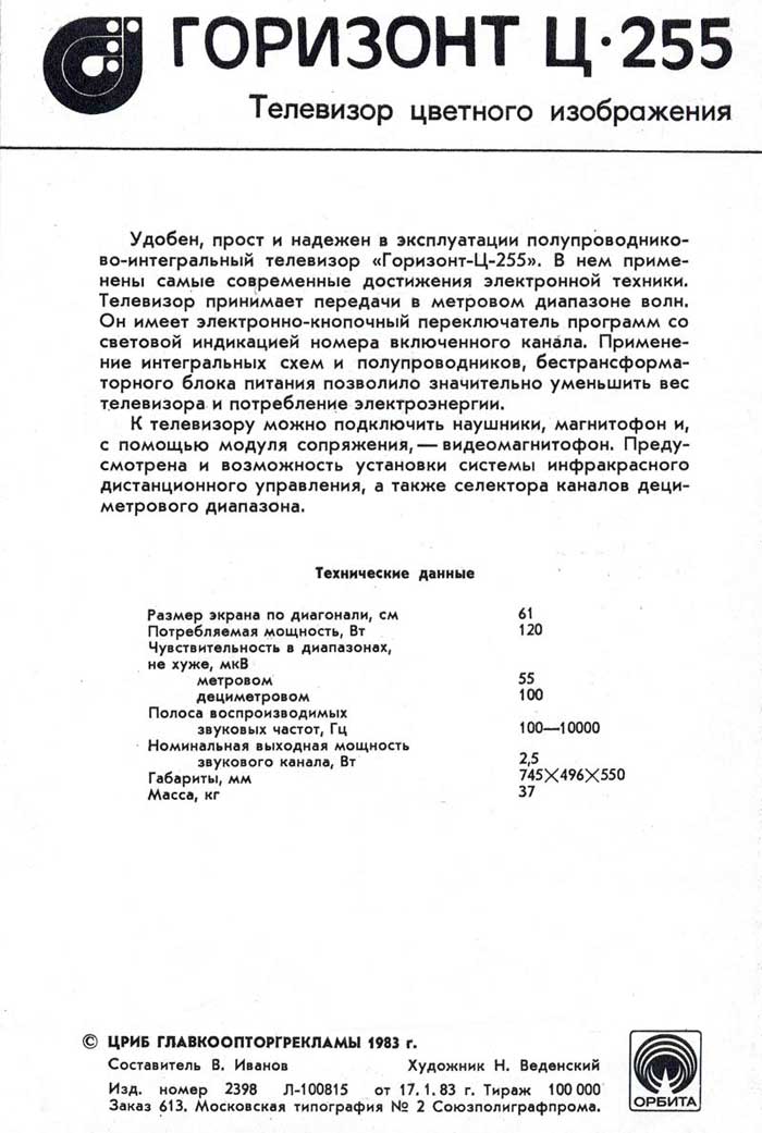 Цветной телевизор *Горизонт Ц-255* с I-кв 1983 года выпускало Минское ПО *Горизонт*. В унифицированном полупроводниково-интегральном телевизоре **Горизонт-Ц-255** применены самые современные достижения электронной техники (на 1982 год). Телевизор принимает передачи в метровом диапазоне волн. Модель имеет электронно-кнопочный переключатель программ со световой индикацией номера рабочего канала. Применение интегральных схем и полупроводников, бестрансформаторного блока питания позволило значительно уменьшить вес аппарата и потребление электроэнергии. К телевизору можно подключить наушники, магнитофон, а с помощью модуля сопряжения и видеомагнитофон. Предусмотрена возможность установки системы инфракрасного ДУ, селектора каналов ДМВ. Диагональ экрана 61 см. Потребляемая мощность 120 Вт. Чувствительность телевизора в МВ диапазоне 55 мкВ, в ДМВ 100 мкВ (при установке селектора). Полоса воспроизводимых частот звука 100...10000 Гц. Номинальная выходная мощность канала звука 2,5 Вт. Габариты телевизора 745х496х550 мм. Масса аппарата без упаковки 37 кг.