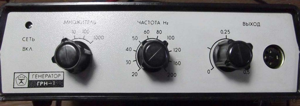 Генератор низкочастотный *ГРН-1* с 1985 года выпускал Вильнюсский завод РИП. Генератор применяется в радиолюбительской практике при настройке низкочастотных устройств. Диапазон генерируемых частот 20 Гц - 200 кГц. Точность установки частоты - 3%. Коээфициент гармоник 3%. Неравномерность АЧХ в полосе частот - 0,8 дБ. Максимальное выходное напряжение при нагрузке 600 Ом - 0,5 В. Питание сеть ~ 220 В.