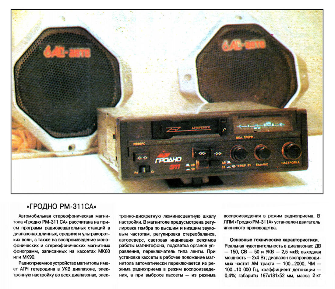 Автомобильная стереомагнитола *Гродно РМ-311СА* с начала 1994 года планировало выпускать Гродненское АПО *Волна*. Автомагнитола работает в диапазонах: ДВ, СВ и УКВ-, а также на воспроизведение моно и стереофонических фонограмм, записанных на кассетах МК-60. Радиоприёмник магнитолы имеет АПЧ гетеродина в УКВ диапазоне, во всех диапазонах электронную настройку на частоту и электронно-дискретную шкалу настройки. Имеются регуляторы тембров ВЧ и НЧ, стереобаланса, автореверс, индикация режимов работы магнитофона, подсветка органов управления аппаратом, переключатель типа магнитной ленты. При установке кассеты в рабочее положение магнитола автоматически переключается из режима приёма в режим воспроизведения, а при выбросе кассеты обратно. Реальная чувствительность в диапазонах: ДВ 150, СВ 50 и УКВ 2,5 мкВ; номинальная выходная мощность 2х4 Вт; диапазон воспроизводимых звуковых частот в AM тракте 100...4000 Гц, ЧМ 100..10000 Гц, коэффициент детонации 0,4%, габариты магнитолы 167х181х52 мм, вес 2 кг.