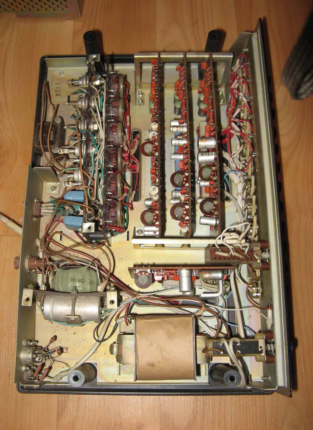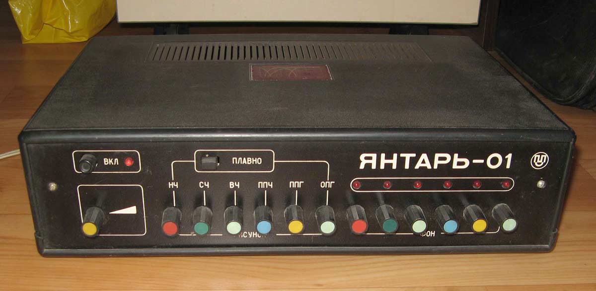 Устройство светодинамическое *Янтарь-01* выпускалось с I-кв 1986 года. УСД предназначено для цветового сопровождения муыкальных произведений при совместной работе с моно или стереофонической аппаратурой, имеющей линейный выход, а может использовано и как цветной светильник с плавной регулировкой яркости ламп для каждого канала отдельно. Устройство не только усиливает эмоциональное воздействие музыкальных произведенй, но и создает особую атмосферу в помещении. В устройстве, по сравнению с выпускающимися подобного типа устройствами, имеются отличительные особенности: 3 режима работ (статический, динамический, смешанный), возможность уменьшения скорости изменения цветового рисунка в динамическом и смешанном режимах работе, большее количество световых каналов, индикация работы каждого канала на блоке управления, использование эффективных способов преобразования звука в свет.