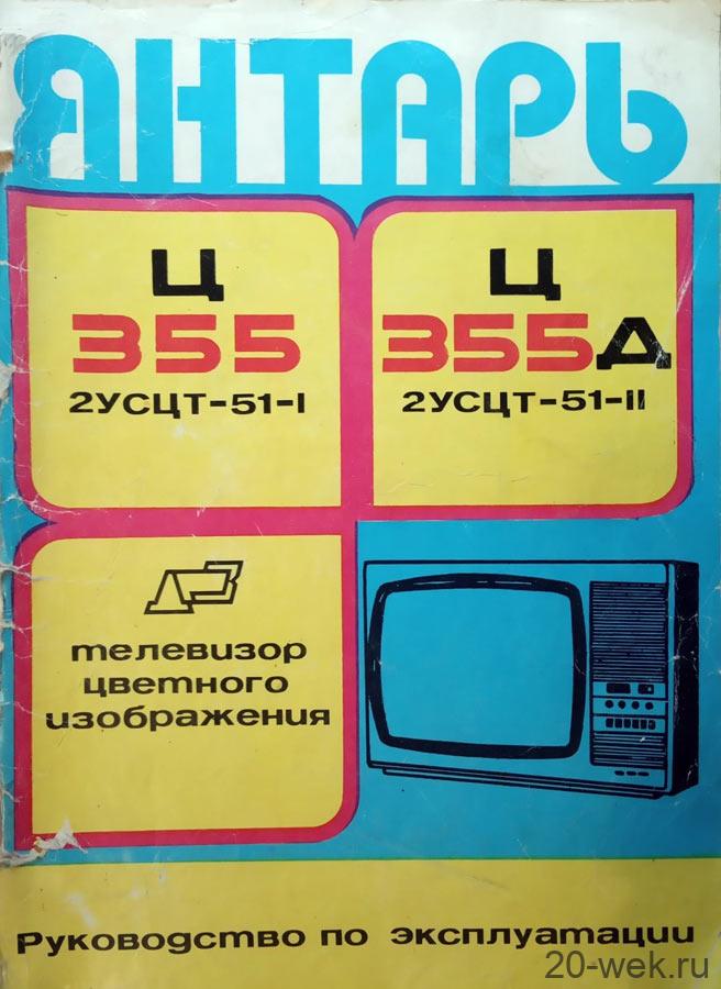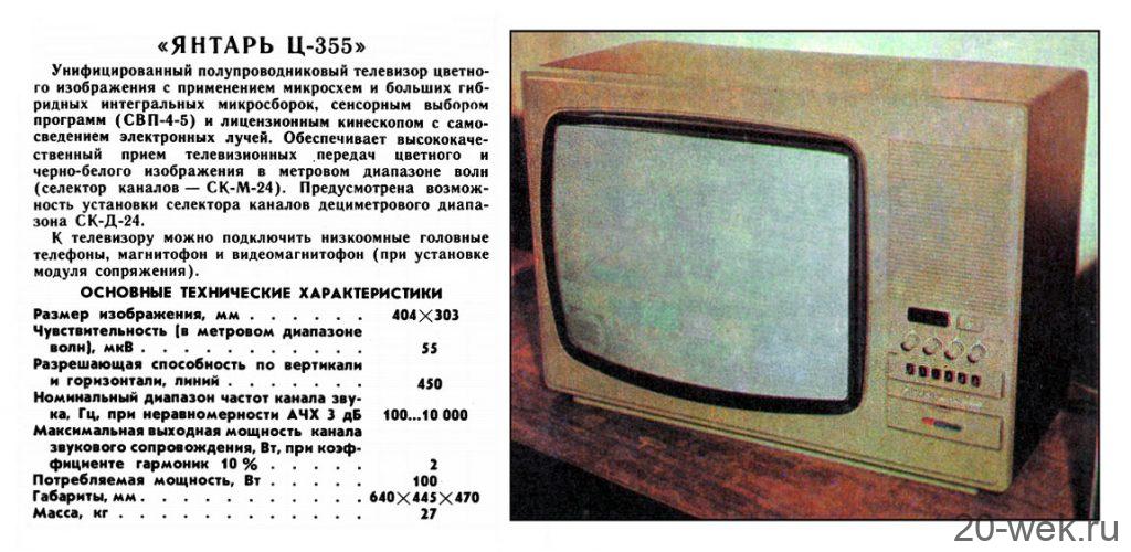 Телевизионный приёмник цветного изображения *Янтарь Ц-355/Д* с 1984 года выпускал Днепропетровский радиозавод. Унифицированный цветной телевизор **Янтарь Ц-355** собран на микросхемах, полупроводниковых приборах и больших интегральных микросборках, сенсорным селектором программ СВП-4-5 и лицензионным кинескопом с самосведением лучей. Модель обеспечивает качественный приём цветного и ч/б изображения в МВ диапазоне. Имеется возможность установки селектора каналов для приёма в ДМВ диапазоне, а модель с индексом *Д* работает в диапазоне МВ и ДМВ. К телевизору можно подключить головные телефоны, магнитофон и видеомагнитофон. Размер экрана 404 х 303 мм. Чувствительность телевизора - 55 мкВ. Чёткость в центре экрана - 450 линий. Диапазон воспроизводимых звуковых частот - 100...10000 Гц. Номинальная выходная мощность канала звука 2 Вт. Питание от сети 220 В. Потребляемая мощность 100 Вт. Габариты телевизора - 640 х 445 х 470 мм. Масса 27 кг.