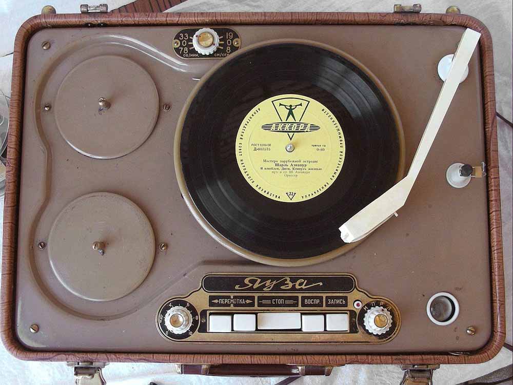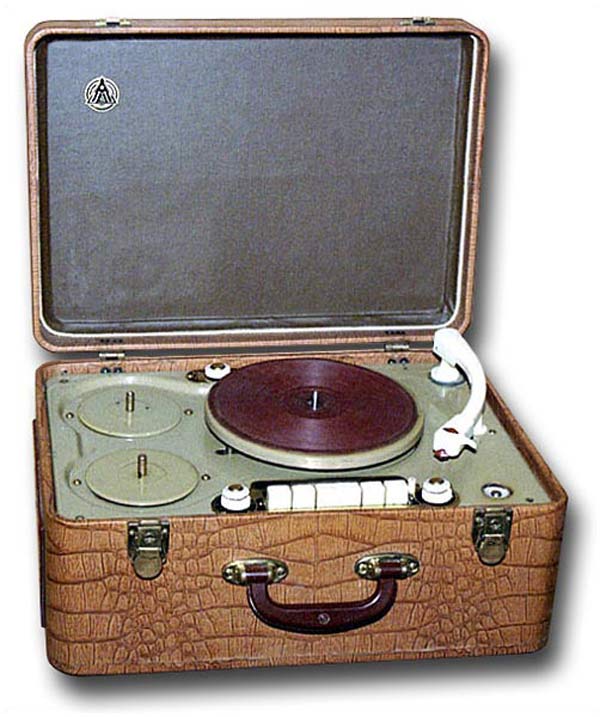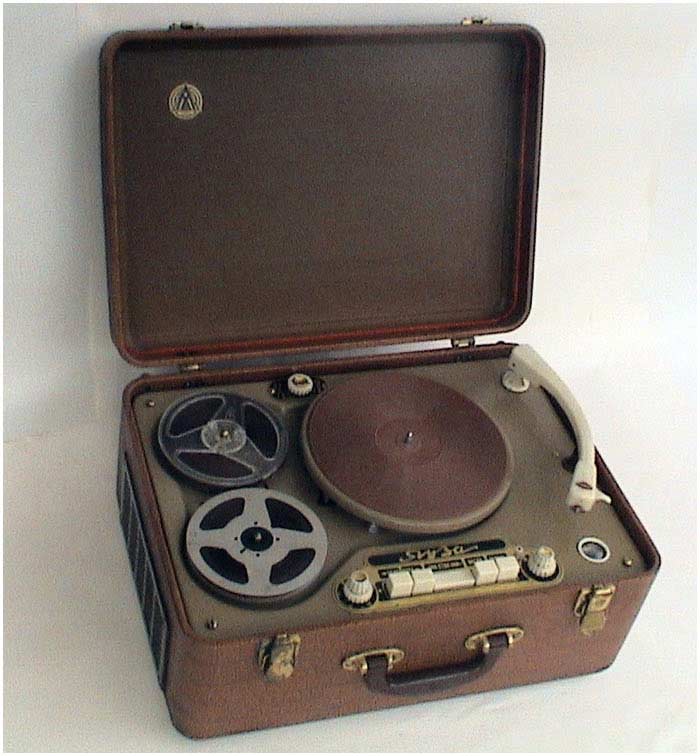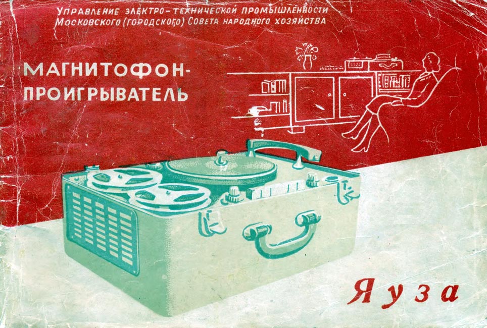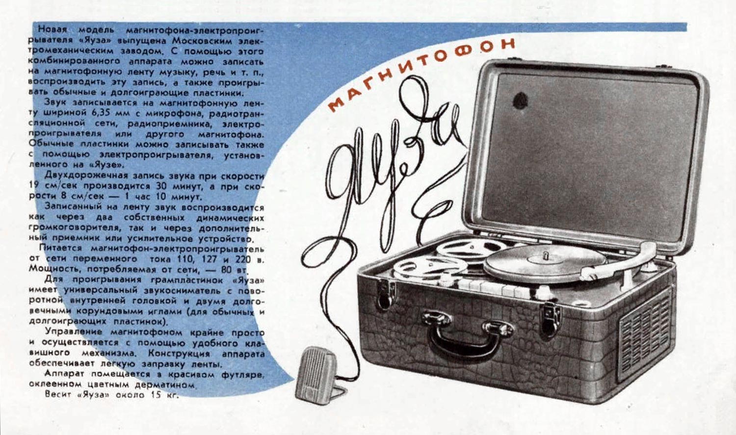 Магнитофон-граммофон *Яуза* (первенец завода) с 1956 года выпускал Московский ЭМЗ №1. Аппарат состоит из магнитофона и проигрывателя пластинок. Магнитофон рассчитан на запись и воспроизведение 2-х дорожечных фонограмм. ЛПМ имеет 2 скорости: 19,5 см/сек и нестандартную 8,13 см/сек, для записи речи. Время записи на 2-х дорожках на 1-й скорости 30 мин, на 2-й 1 час.10 мин. Катушки вмещают 180 метров магнитной ленты типа 1. Есть ускоренная перемотка ленты (2,5 мин.) в прямом и обратном направлениях. ЛПМ приводится в действие двигателем АД-2 и управляется клавишным переключателем. На выходе включены два громкоговорителя 1ГД-9. Полоса частот на 1-й скорости 70....7000 Гц, на 2-й 100...4000 Гц. Есть разъём для дополнительного громкоговорителя и вход адаптера. ЭП двухскоростной, с пьезокерамическим звукоснимателем с 2-мя долговечными корундовыми иглами для обычных и долгоиграющих пластинок. Питание от сети 110, 127 и 220 В. Потребляемая мощность ~ 80 Вт. Установка размещена в переносном футляре размерами 470х360х215 мм, оклеенном дермантином. В комплекте пьезоэлектрический микрофон. Масса модели 18 кг. На 1-м рисунке нулевой вариант аппарата, который в серию не пошёл. В серию пошёл 1-й вариант, он на всех фото. Был и 2-й вариант, отличавшийся громкоговорителями, изменениями в схеме, монтаже, ЛПМ и ЭПУ. Внешний вид был как у 1-го варианта. Радио №8/1963 ст.48