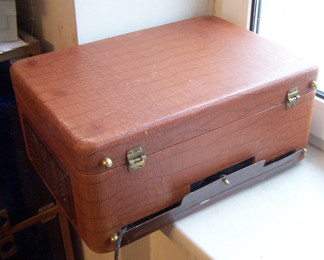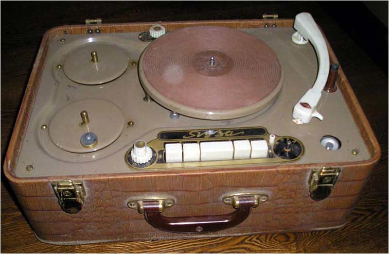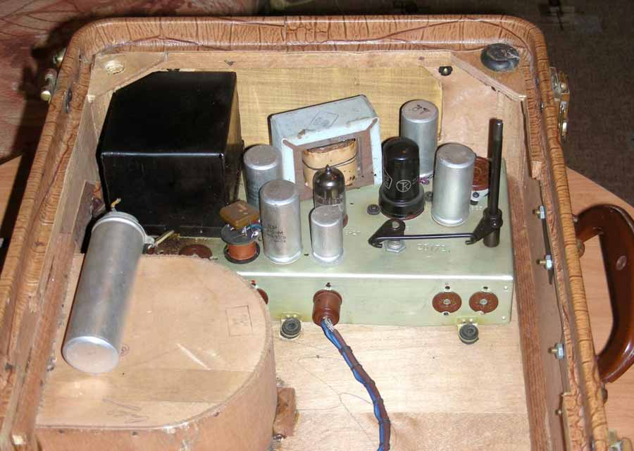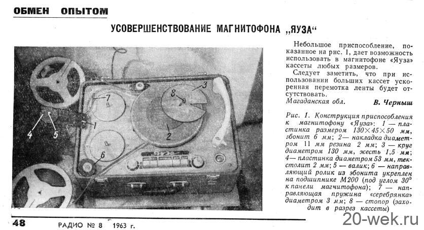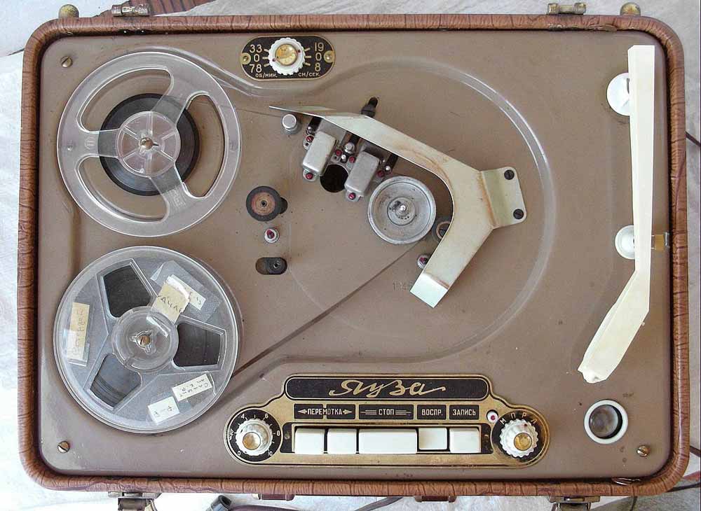 Магнитофон-граммофон *Яуза* (первенец завода) с 1956 года выпускал Московский ЭМЗ №1. Аппарат состоит из магнитофона и проигрывателя пластинок. Магнитофон рассчитан на запись и воспроизведение 2-х дорожечных фонограмм. ЛПМ имеет 2 скорости: 19,5 см/сек и нестандартную 8,13 см/сек, для записи речи. Время записи на 2-х дорожках на 1-й скорости 30 мин, на 2-й 1 час.10 мин. Катушки вмещают 180 метров магнитной ленты типа 1. Есть ускоренная перемотка ленты (2,5 мин.) в прямом и обратном направлениях. ЛПМ приводится в действие двигателем АД-2 и управляется клавишным переключателем. На выходе включены два громкоговорителя 1ГД-9. Полоса частот на 1-й скорости 70....7000 Гц, на 2-й 100...4000 Гц. Есть разъём для дополнительного громкоговорителя и вход адаптера. ЭП двухскоростной, с пьезокерамическим звукоснимателем с 2-мя долговечными корундовыми иглами для обычных и долгоиграющих пластинок. Питание от сети 110, 127 и 220 В. Потребляемая мощность ~ 80 Вт. Установка размещена в переносном футляре размерами 470х360х215 мм, оклеенном дермантином. В комплекте пьезоэлектрический микрофон. Масса модели 18 кг. На 1-м рисунке нулевой вариант аппарата, который в серию не пошёл. В серию пошёл 1-й вариант, он на всех фото. Был и 2-й вариант, отличавшийся громкоговорителями, изменениями в схеме, монтаже, ЛПМ и ЭПУ. Внешний вид был как у 1-го варианта. Радио №8/1963 ст.48
