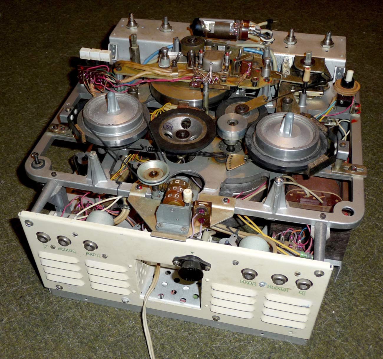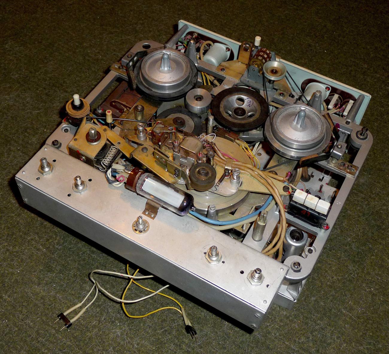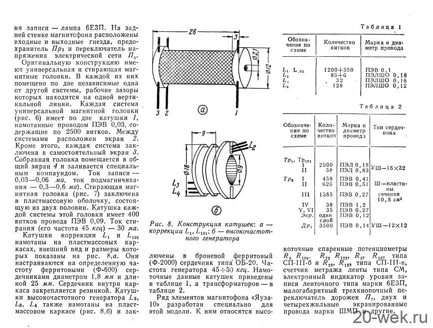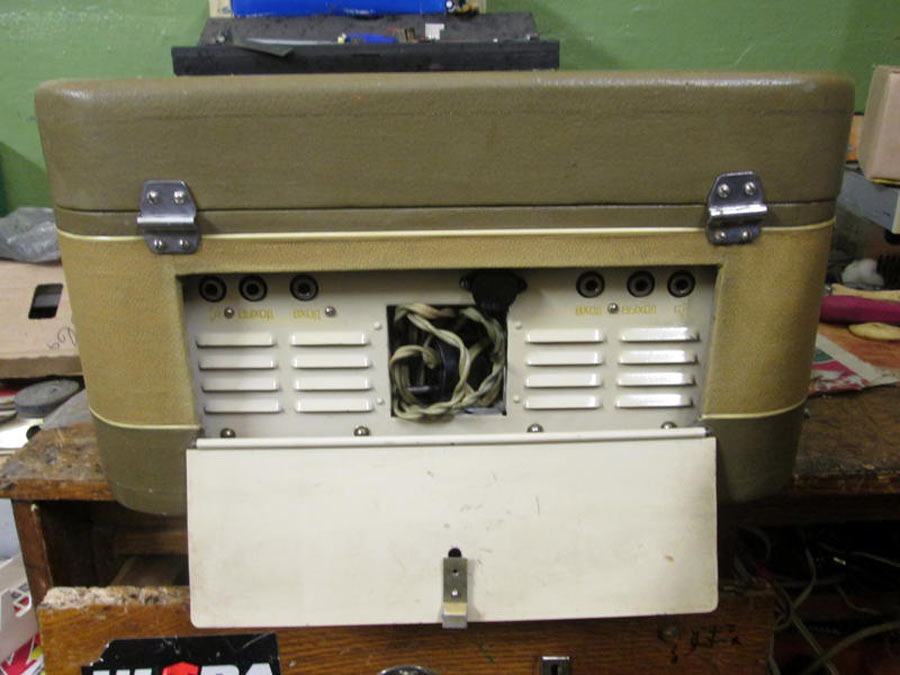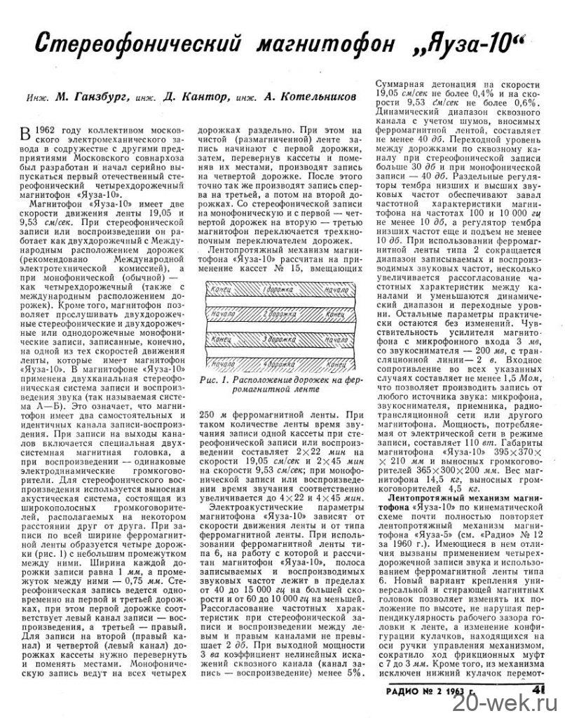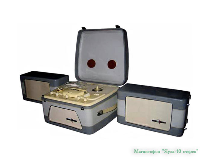 Стереофонический магнитофон *Яуза-10* с начала 1961 года выпускал Московский электромеханический завод № 1. **Яуза-10** - это первый отечественный стереофонический четырёхдорожечный магнитофон. Он имеет две скорости движения магнитной ленты; 19,05 и 9,53 см/сек. При стереофонической записи он работает как двухдорожечный, при монофонической, как четырехдорожечный. В модели применена двухканальная стереофоническая система записи и воспроизведения звука, для чего используются две малогабаритные акустические системы которые состоят из широкополосных громкоговорителей. Кроме того в магнитофоне имеется контрольный громкоговоритель. Лентопротяжный механизм магнитофона рассчитан на применение катушек № 15 вмещающих 250 метров ферромагнитной ленты. Время звучания катушки при стереозаписи 2х22 минуты на скорости 19 и 2х45 минут на скорости 9. При монофонической записи время увеличивается до 4х22 и 4х45 мин. Акустические параметры магнитофона зависят от скорости и типа ленты. При использовании ленты типа 6 на работу с которой рассчитан магнитофон, полоса рабочих частот 40...15000 Гц на большей скорости и 60...10000 Гц на меньшей. При выходной мощности 3 Вт КНИ сквозного канала 5%. Детонация на скорости 19,05 см/сек - 0,4%, на 9,53 см/сек - 0,6%. Динамический диапазон сквозного канала 40 дБ. Переходной уровень между дорожками по сквозному каналу при стереофонической записи 30 дБ, монофонической 40 дБ. Регуляторы тембра НЧ, ВЧ обеспечивают завал АЧХ на 10 дБ а тембра НЧ еще и подъём на 10 дБ. При использовании магнитной ленты типа 2 сужается диапазон рабочих звуковых частот и увеличивается рассогласование АЧХ между каналами, уменьшаются динамический диапазон и переходные уровни. Чувствительность с микрофона 3 мВ, со звукоснимателя 200 мВ, радиолинии 2 В. Потребляемая мощность при записи 110 Вт. Размеры магнитофона 395х370х210 мм. Выносных АС 365х300х200 мм. Масса аппарата 14,5 кг, выносных АС 4,5 кг вместе. Цена магнитофона 400 рублей. В схему магнитофона неоднократно вносили измения. Его выпуск завершился в 1967 году. Радио №2/1963 ст.41
