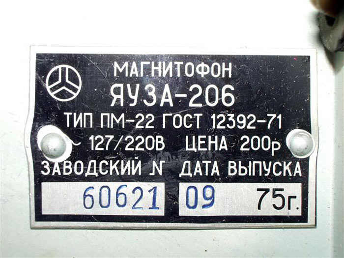 Катушечный магнитофон *Яуза-206* с 1972 года выпускал Московский ЭМЗ №1. Магнитофон 2-го класса **Яуза-206** модернизация модели **Яуза-6** проведенной в связи с введением ГОСТа 12392-71. Изменения связаны с переходом на ленту типа 10 и введением раздельных регуляторов записи, громкости и тембров. ЛПМ аппаратов аналогичны. В новый аппарат введён механический счетчик ленты и сменён индикатор уровня записи на ламповый. Магнитная лента А 4402-6. Число дорожек 2. Катушки №15. Скорости 9,53 и 4,76 см/с. Коэффициент детонации на скорости 9,53 см/с ±0,3%, 4,76 см/с ±0,4%. Диапазон частот на скорости 9,53 см/с - 63...12500 Гц, 4,76 см/с 63...6300 Гц. Коэффициент нелинейных искажений на ЛВ 4%, на эквиваленте громкоговорителя 5%. Номинальная выходная мощность 2 Вт. Выходное напряжение линейного выхода 0,5 В. Питание от сети. Потребляемая мощность 80 Вт. Габариты магнитофона 380х320х180 мм. Его масса 11,5 кг.