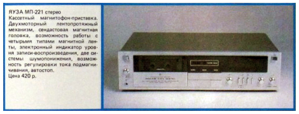 Стереофонические магнитофоны-приставки *Яуза МП-221С*, *Яуза МП-221-1С* и *Яуза МП-221С-2* соответственно с I-кв 1987, 1989 и с 1990 года выпускал Московский ЭМЗ № 1. Стационарный кассетный стереофонический магнитофон-приставка **Яуза МП-221C** позволяет производить запись звуковых программ на магнитную ленту в кассетах МК-60 или МК-90 с последующим их воспроизведением при помощи внешнего усилителя с АС. Прослушать запись можно и на стереотелефоны. МП обладает рядом эксплуатационных удобств: возможность работы с тремя типами магнитных лент, регулировки тока подмагничивания, наличие электронно-логической системы управления, двух шумопонижающих устройств, компандерного и динамического фильтра, режима откат. В МП используется двухмоторный ЛПМ, применена сендастовая головка, двухцветный люминесцентный индикатор контроля уровня записи и воспроизведения. Скорость движения ленты 4,76 см/с. Коэффициент детонации ±0,19%. Рабочий диапазон частот при работе с лентой Fe - 31,5...14000 Гц, Cr - 31,5...16000 Гц. Коэффициент гармоник на ЛВ - 2,5%. Отношение сигнал/шум с СШП и лентой Cr -62 дБ. Потребляемая мощность 15 Вт. Габариты 430 х 270 х 114 мм. Вес 4,5 кг. Цена 420 рублей. Все МП были схожи по конструкции, схеме и параметрам. Но были и отличия, так модель *Яуза МП-221С* в небольшой серии имела английские надписи на лицевой стороне и электродвигатель в ЛПМ стоял отечественного или японского производства. Модель *Яуза 221-1С* отличалась тем что в ней стоял люминесцентный индикатор от усилителя *Радиотехника У101С* и ещё механический счетчик. В модели *Яуза МП-221С-2* стоял уже цифровой счетчик, от *Радиотехники М-201С*.