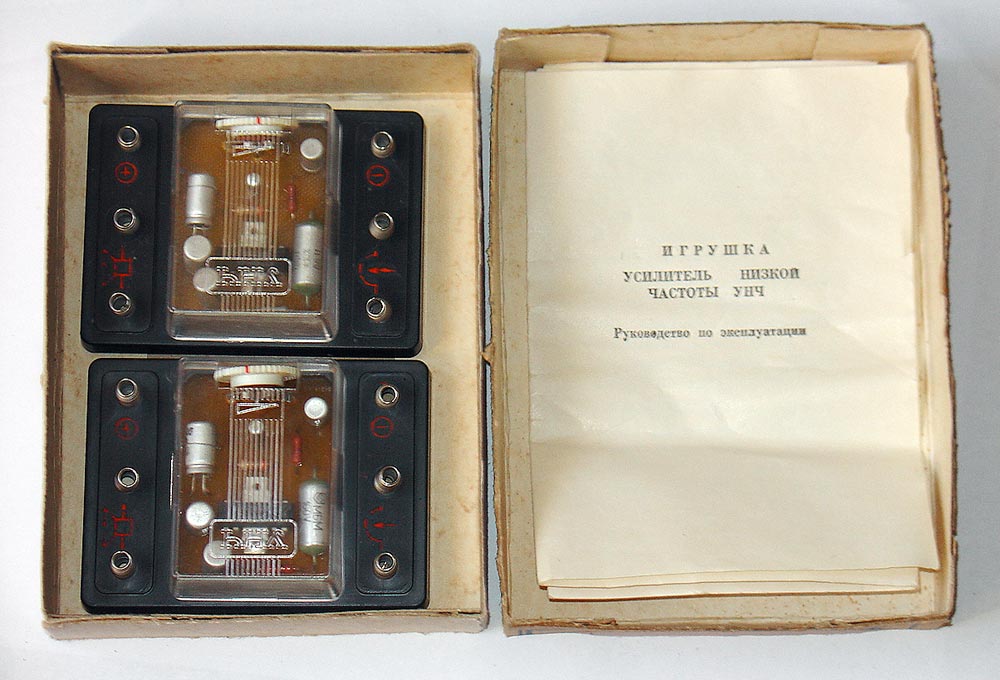 Игрушка *Усилитель низкой частоты* с 1989 года выпускал Павлодарский завод *Весна*. Игрушка УНЧ предназначена для технического творчества детей среднего и старшего школьного возраста знакомых с основами радиоэлектроники и для начинающих радиолюбителей. Игрушка представляет собой модульный блок, который может быть использован для усиления громкости звукового сигнала в любительских конструкциях. Его номинальная выходная мощность не менее 0,25, максимальная мощность 0,6 Вт. Ток потребления при отсутствии сигнала 10 мА. Максимальный ток потребления при нагрузке 8 Ом - 100 мА. Входное сопротивление 10 кОм. Напряжение входного сигнала 0,14 В. Габариты усилителя 40x07x30 мм. Масса 0,15 кг.