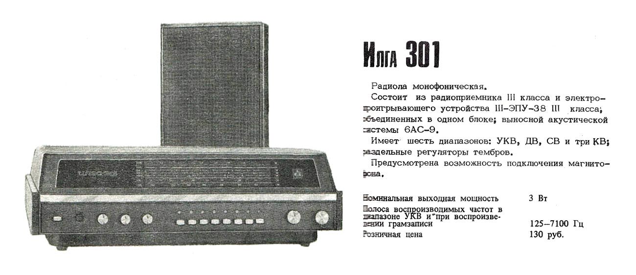 Стационарная транзисторная радиола *Илга-301* с 1979 года выпускалась Иркутским радиозаводом. Радиола **Илга-301** работает в диапазонах ДВ, СВ, КВ (3 поддиапазона), УКВ, и проигрывает грампластинок всех форматов. Модель разработана на базе радиолы **Вега-315**. В ней используется трёхскоростное ЭПУ III-ЭПУ-38. **Илга-301** работает на АС **6АС-9**, где установлены головки: 6ГД-6 и 3ГД-31. В модели имеется АПЧ в диапазоне УКВ, регулировка тембра НЧ и ВЧ, световая индикация рода работы. Чувствительность в АМ 200 мкВ, ЧМ 15 мкВ. Выходная мощность 3 Вт. Диапазон частот в АМ 100...3550 Гц, ЧМ 100...10000 Гц. Потребляемая мощность 14/40 Вт. Габариты модели - 534х377х164 мм. Вес 16 кг. Цена 115 рублей. С 1981 года завод выпускал модель *Илга-301-1*, которая кроме иного оформления АС, другого ЭПУ, небольших изменений схемы и более современных радиоэлементов аналогична базовой.