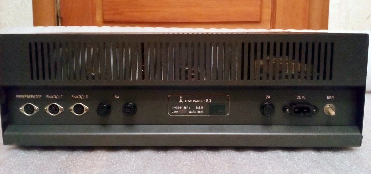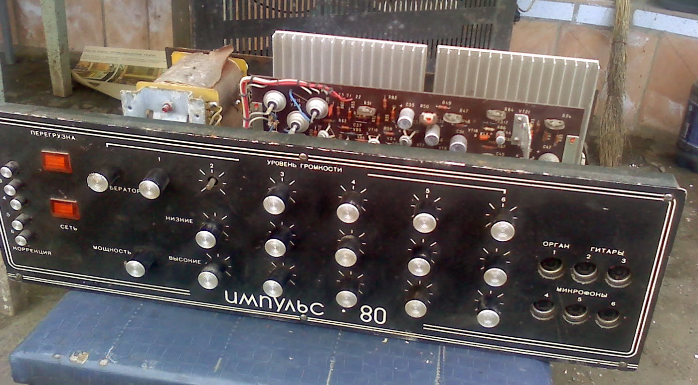 Усилитель НЧ *Импульс-80* выпускался предположительно с 1978 года Херсонским заводом полупроводниковых приборов. Предназначен для усиления низкочастотных сигналов от микрофонов, электрогитар, электроорганов, синтезаторов, магнитофонов и других источников. Рассчитан на работу в составе эстрадных музыкальных ансамблей. Устройство состоит из монофонического усилителя НЧ с микшером шести каналов в одном корпусе, имеет три микрофонных входа, два входа для подключения электрогитар и один для подключения электрооргана. На каждый из 6 первых входов, предусмотрена регулировка уровня громкости, а так же тембра по высшим и низшим звуковым частотам. Есть выход на *петлю* эффектов с регулировкой уровня и два выхода на акустические системы. В усилителе предусмотрена электронная защита от короткого замыкания нагрузки, имеется индикатор перегрузки, позволяющий следить за режимом его работы. Выпускался усилитель в двух вариантах внешнего оформления и с двумя АС (2 типа). Номинальная выходная мощность усилителя 75 Вт на нагрузке 6 Ом. Максимальная выходная мощность 150 Вт. Номинальный диапазон частот усили теля 30...20000 Гц. КНИ 1%. Диапазон регулировки тембра ±12 дБ. Потребляемая мощность не более 300 Вт.