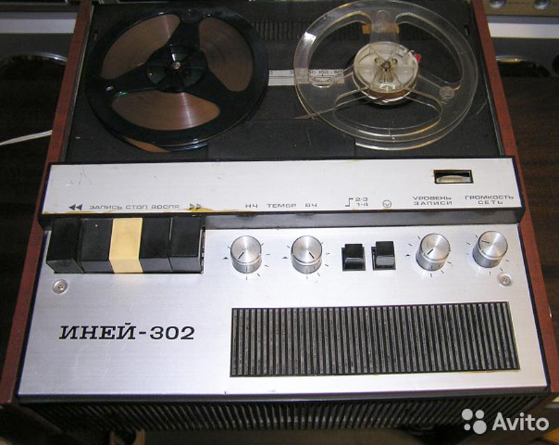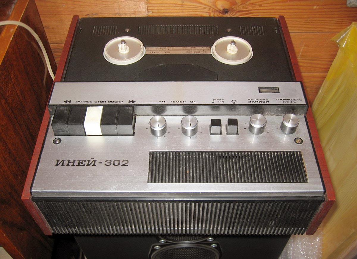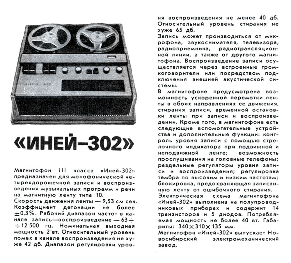 Катушечный магнитофон *Иней-302* с 1972 года выпускал Новосибирский электромеханический завод. Транзисторный четырёхдорожечный магнитофон 3 класса **Иней-302** предназначен для записи и воспроизведения фонограмм на магнитной ленте А4402-6, на скорости 9,53 см/сек. Магнитофон позволяет производить запись с микрофона, радиоприёмника, телевизора, радиосети, звукоснимателя, ЭПУ и магнитофона. Уровень записи контролируется стрелочным индикатором. К магнитофону можно подключить внешний усилитель ЗЧ с АС. Потребляемая мощность 40 Вт. Диапазон рабочих частот 63...12500 Гц. Время записи на катушках № 15 на одной дорожке 65 минут, на 4-х дорожках 4 часа 20 мин. Время перемотки при использовании катушки № 15 не более 180 секунд. Регулировка тембра по НЧ 10 дБ, по ВЧ 14 дБ. Громкоговорителей 1ГД-40 - 2 шт. Номинальная выходная мощность 2 Вт. Габариты магнитофона - 140х355х375 мм. Масса 9,5 кг.
