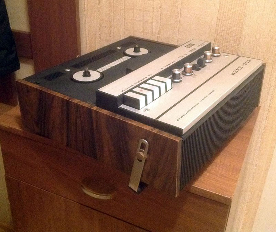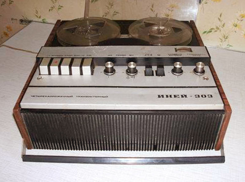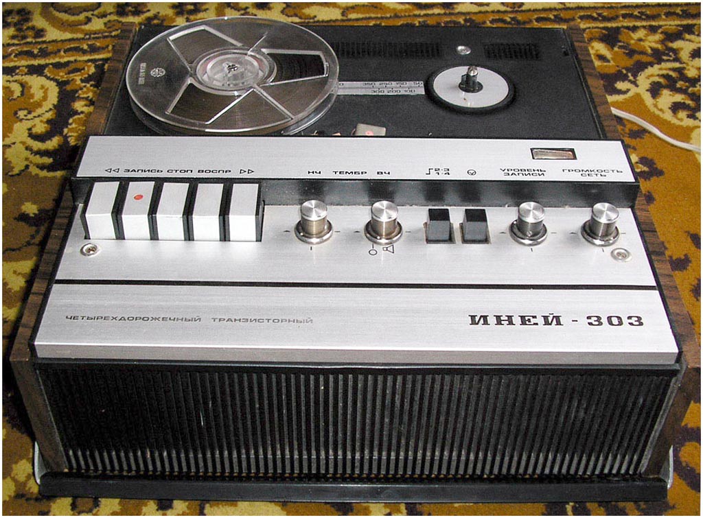 Катушечный транзисторный магнитофон *Иней-303* с 1976 года выпускал Новосибирский ЭМЗ. Магнитофон создан на основе предыдущей модели **Иней-302** и предназначен для записи и воспроизведения фонограмм на магнитной ленте типа А4407-6Б и скорости 9,53 см/сек. Диапазон рабочих звуковых частот 63...12500 Гц. Номинальная выходная мощность 1,5 Вт, максимальная 3 Вт. Габариты магнитофона 140х355х375 мм. Масса 9,5 кг.