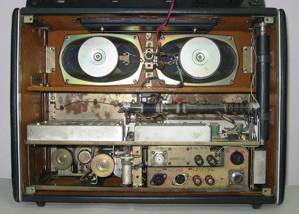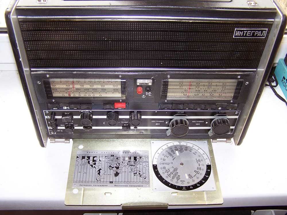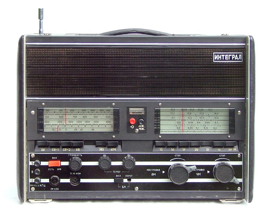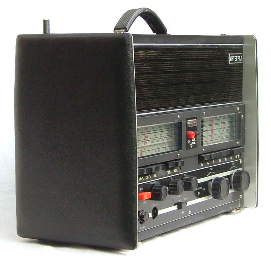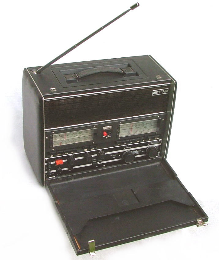 Стационарный транзисторный радиоприёмник *Интеграл* с I-кв 1980 года выпускал Днепропетровский радиозавод. Всеволновый войсковой приёмник *Интеграл* с универсальным питанием предназначен для приёма широковещательных передач с амплитудной модуляцией в диапазонах ДВ, СВ и KB и c частотной модуляцией в диапазоне УКВ. Приёмник предназначен для комплектации войсковых радиотрансляционных узлов или использовании его в составе походных технических средств пропаганды. Радиоприём осуществляется на ферритовую антенну в диапазонах ДВ, СВ и телескопическую в диапазонах KB и УКВ. Есть возможность приёма на всех диапазонах на внешние антенны типа **Наклонный луч** или **Штырь**. При работе от внешней антенны ферритовая антенна отключается. В приёмнике имеются гнёзда внешней антенны и заземления; источника питания; нагрузки; УКВ антенны; усилителя или магнитофона на запись; телефонов с одновременным отключением громкоговорителей. Для уверенного радиоприёма в схеме имеется: устройство защиты входа от перегрузок; бесшумная настройка с регулируемым порогом; переключение полосы УПЧ АМ на 6, 9 и 12 кГц; световой индикатор точной настройки на станцию; двойное преобразование частоты в диапазонах КВ. Для удобства предусмотрены: три шкалы с подсветкой соответствующего работающего диапазона; механический фиксатор настройки для устранения расстройки при воздействии вибрационных нагрузок; есть дежурный режим работы для уменьшения расхода батарей при длительной и непрерывной эксплуатации приёмника; индикатор разряда батарей.