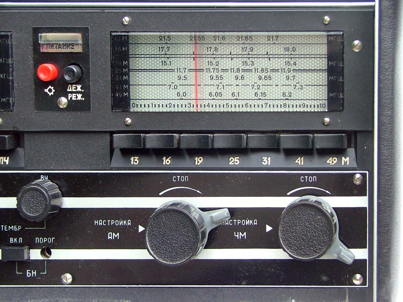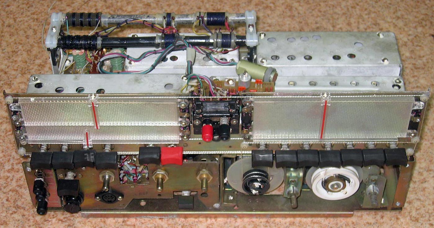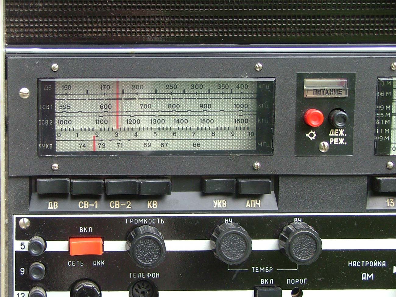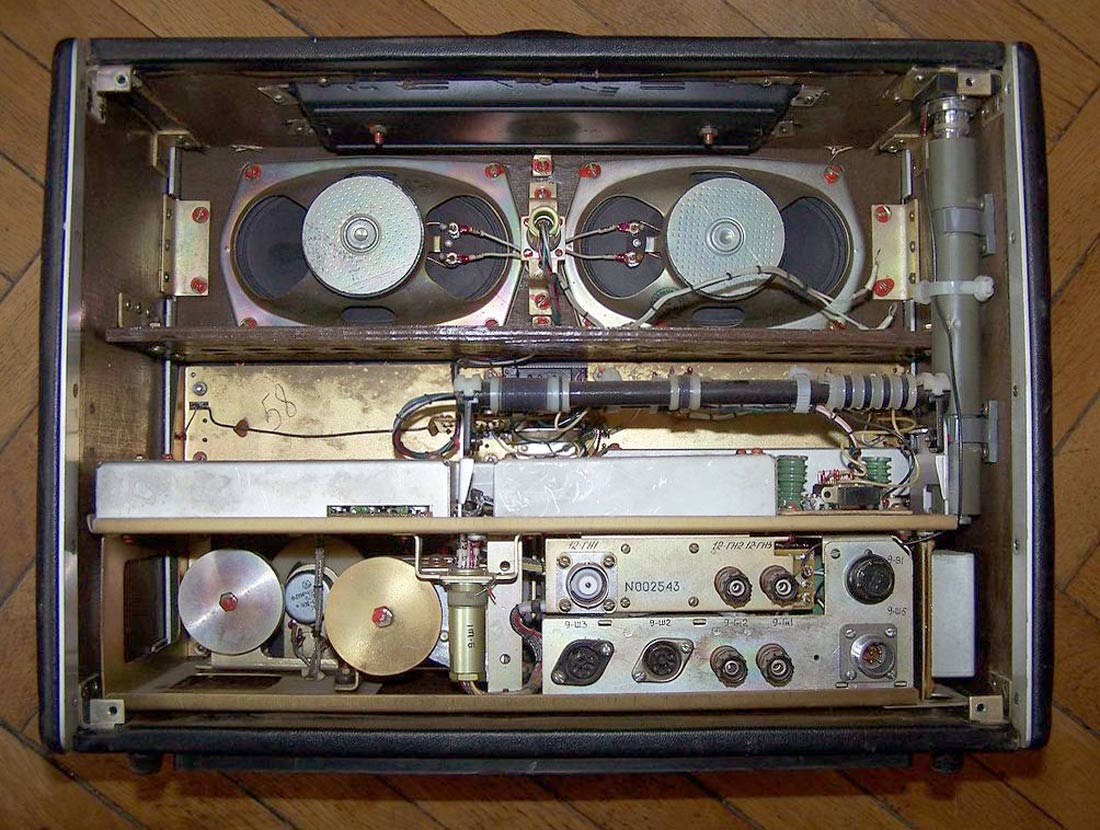 Стационарный транзисторный радиоприёмник *Интеграл* с I-кв 1980 года выпускал Днепропетровский радиозавод. Всеволновый войсковой приёмник *Интеграл* с универсальным питанием предназначен для приёма широковещательных передач с амплитудной модуляцией в диапазонах ДВ, СВ и KB и c частотной модуляцией в диапазоне УКВ. Приёмник предназначен для комплектации войсковых радиотрансляционных узлов или использовании его в составе походных технических средств пропаганды. Радиоприём осуществляется на ферритовую антенну в диапазонах ДВ, СВ и телескопическую в диапазонах KB и УКВ. Есть возможность приёма на всех диапазонах на внешние антенны типа **Наклонный луч** или **Штырь**. При работе от внешней антенны ферритовая антенна отключается. В приёмнике имеются гнёзда внешней антенны и заземления; источника питания; нагрузки; УКВ антенны; усилителя или магнитофона на запись; телефонов с одновременным отключением громкоговорителей. Для уверенного радиоприёма в схеме имеется: устройство защиты входа от перегрузок; бесшумная настройка с регулируемым порогом; переключение полосы УПЧ АМ на 6, 9 и 12 кГц; световой индикатор точной настройки на станцию; двойное преобразование частоты в диапазонах КВ. Для удобства предусмотрены: три шкалы с подсветкой соответствующего работающего диапазона; механический фиксатор настройки для устранения расстройки при воздействии вибрационных нагрузок; есть дежурный режим работы для уменьшения расхода батарей при длительной и непрерывной эксплуатации приёмника; индикатор разряда батарей.