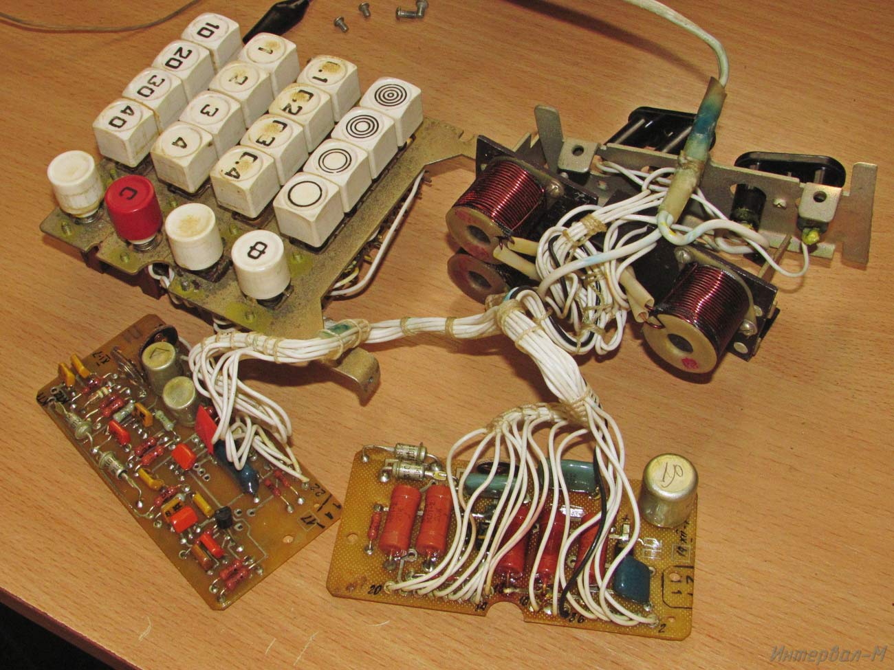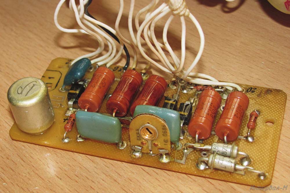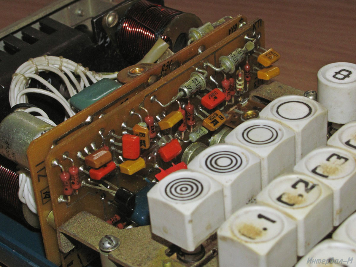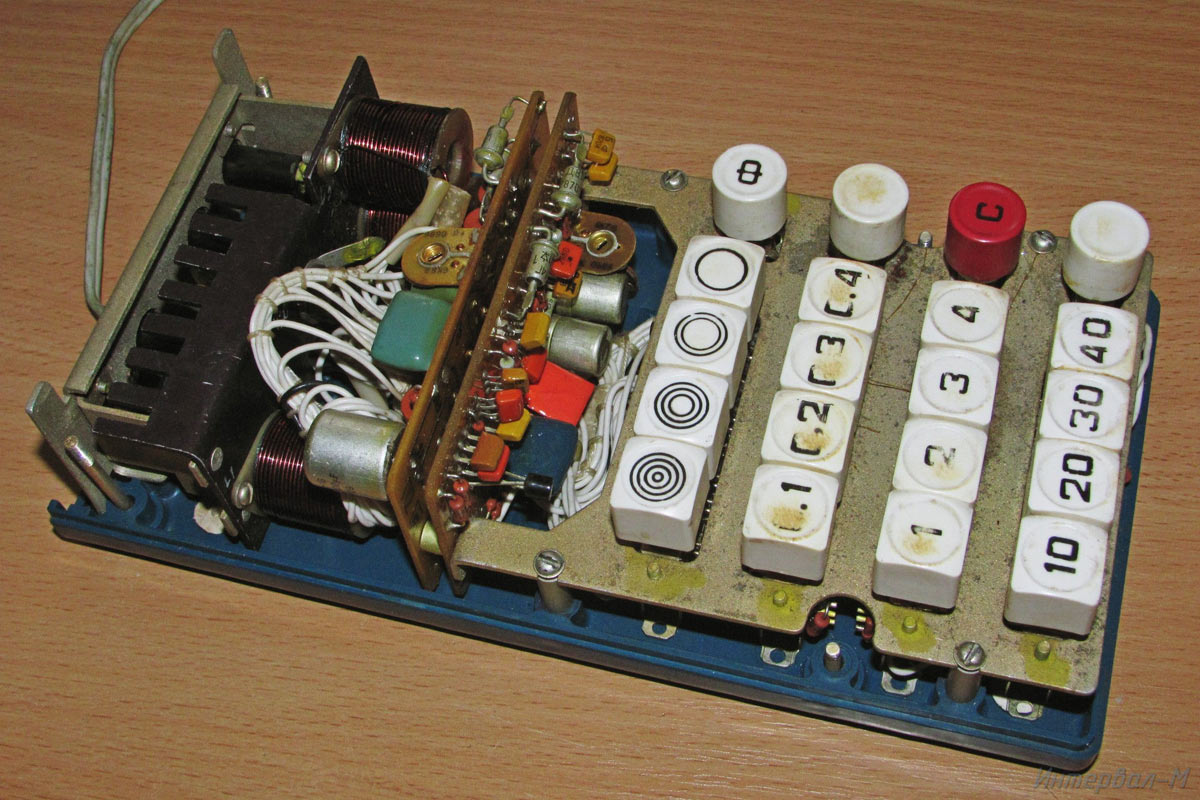 Реле времени электронное *Интервал-М* выпускалось с 1987 года. В реле применено бесконтактное коммутирующее устройство, обеспечивающее реле высокую стабильность и надежность в работе, также предусмотрено пятиступенчатое переключение мощности лампы до 500 Вт. Диапазон выдержек: 0,1...111 секунд. Авторство фотографий утеряно.