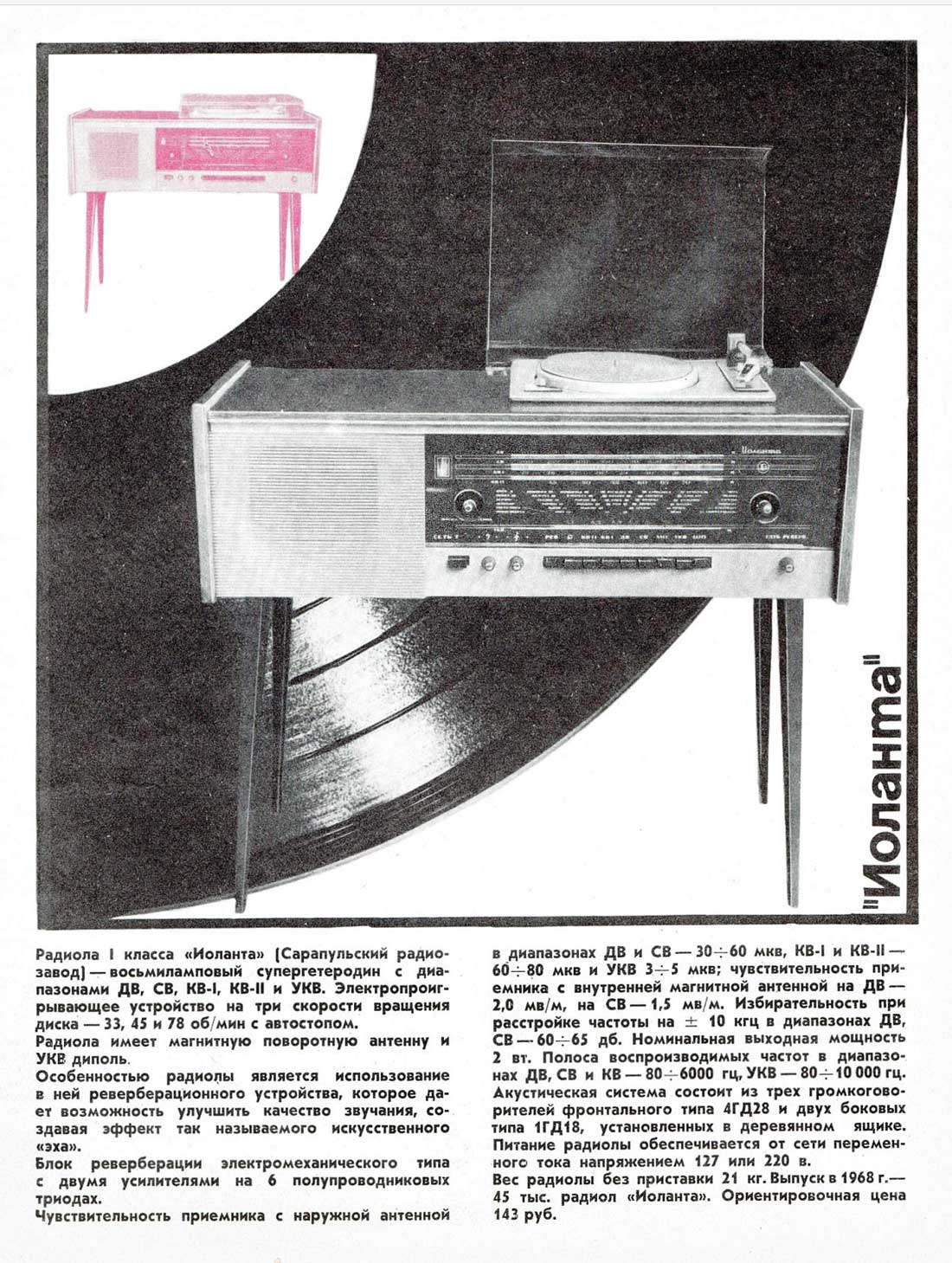 Радиола сетевая ламповая *Иоланта* с осени 1968 года выпускалась Сарапульским заводом имени Орджоникидзе. Радиола 1-го класса **Иоланта** (в переводе с удмуртского означает фиалка), внутризаводское наименование модели *Урал-7*, аналогична радиоле **Урал-6** того же Сарапульского завода и отличается только добавочным транзисторным блоком для искусственной реверберации в звучании.