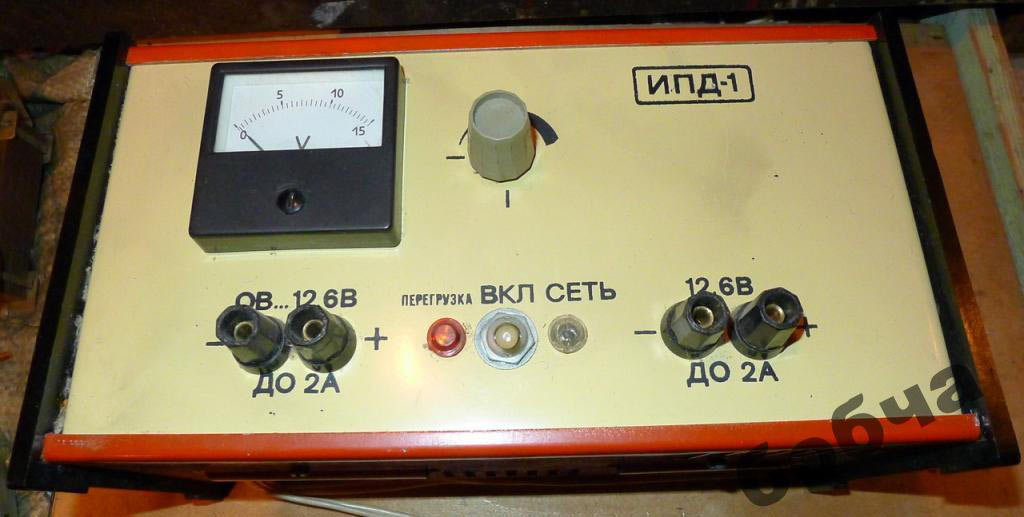 Источник питания демонстрационный *ИПД-1* выпускался предположительно с 1967 года. Источник питания предназначен для питания различных электрических схем и приборов, используемых при проведении демонстрационных опытов на уроках физики в общеобразовательной школе и (или) в других учебных заведениях. Величина регулируемого напряжения 0...12,6 вольт - контролируется по вольтметру, установленному на передней панели корпуса. На этой же панели размещены ручка регулятора выходного стабилизированного напряжения, тумблер для включения прибора, индикатор подключения к электросети и индикатор перегрузки стабилизированного выхода. Индикатор перегрузки срабатывает при превышении током нагрузки величины 2 А.