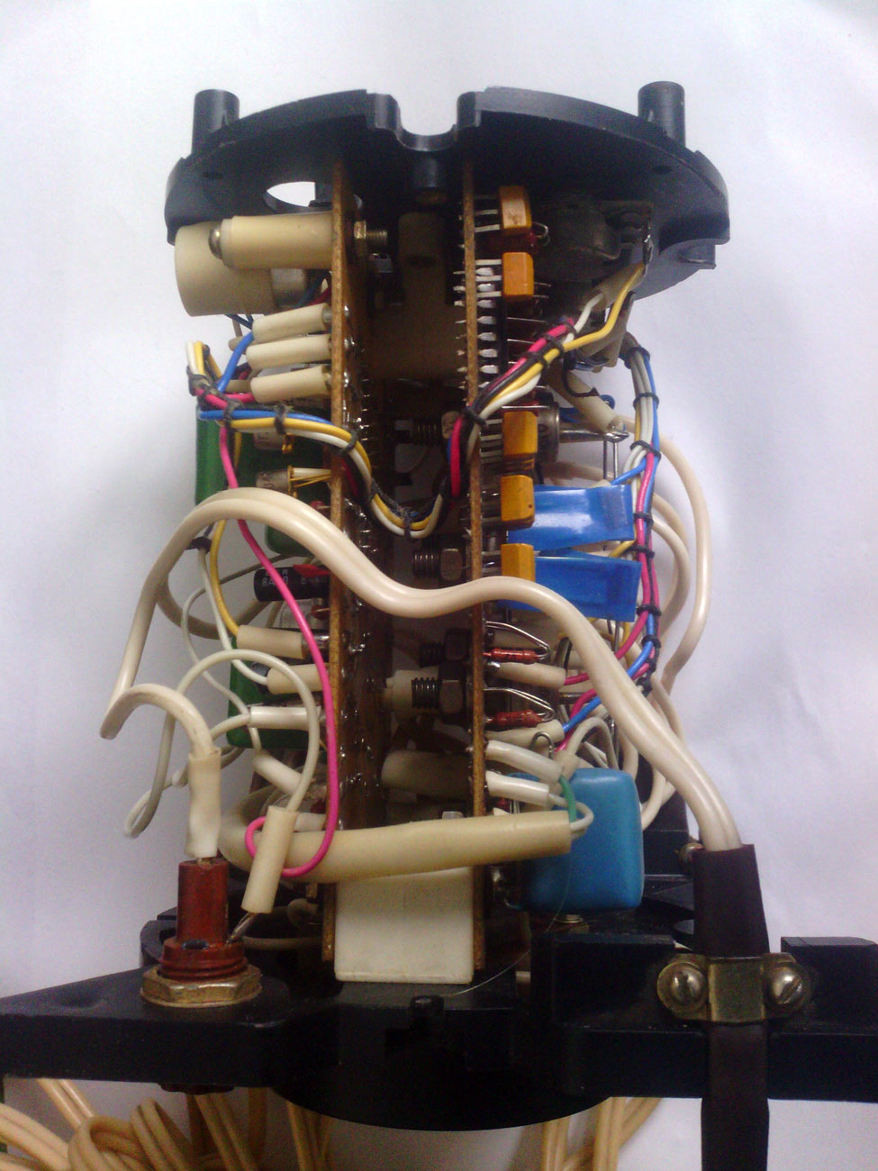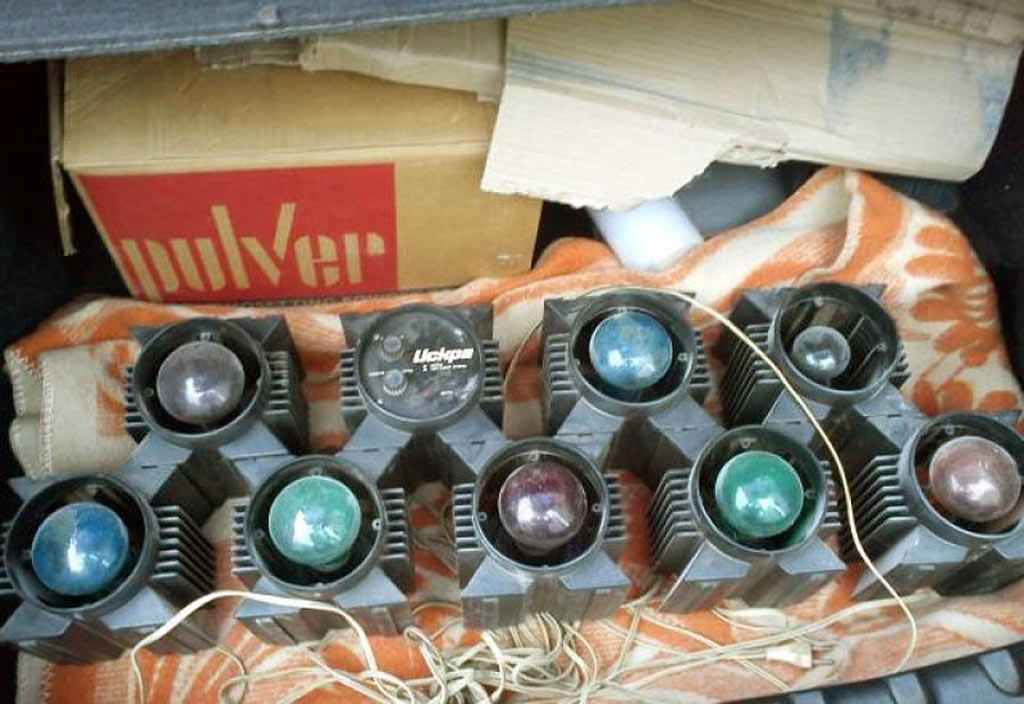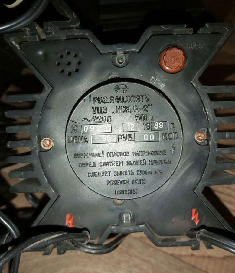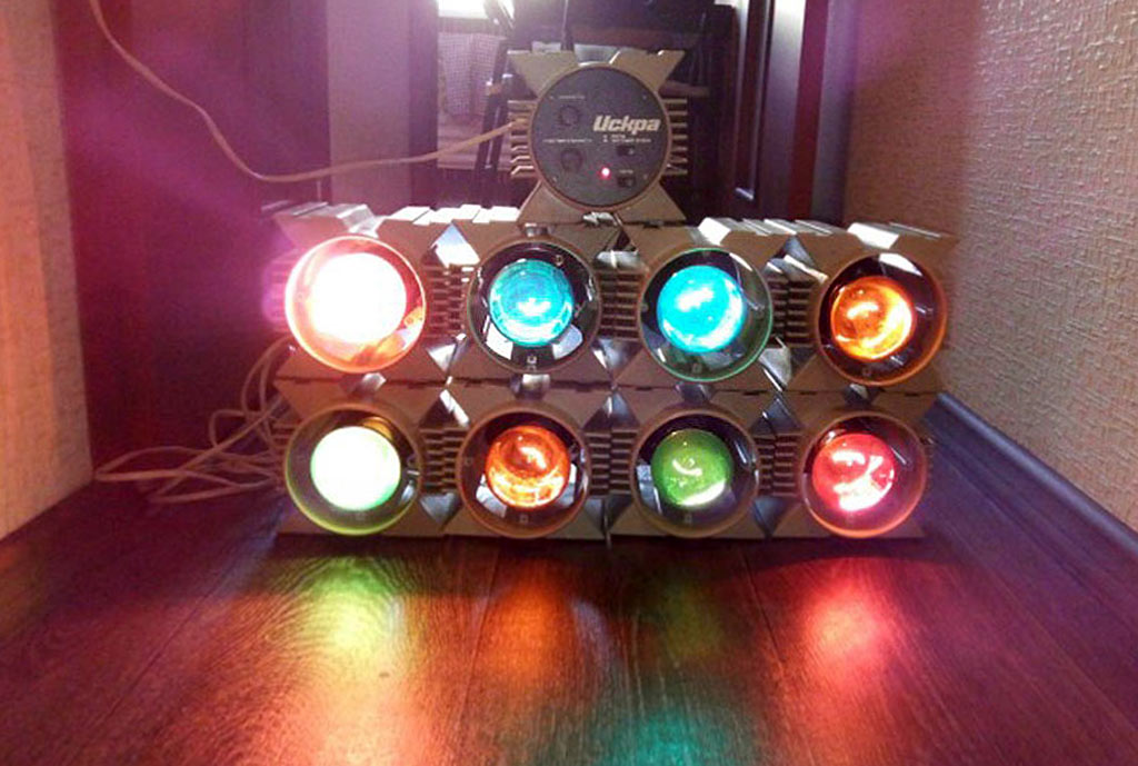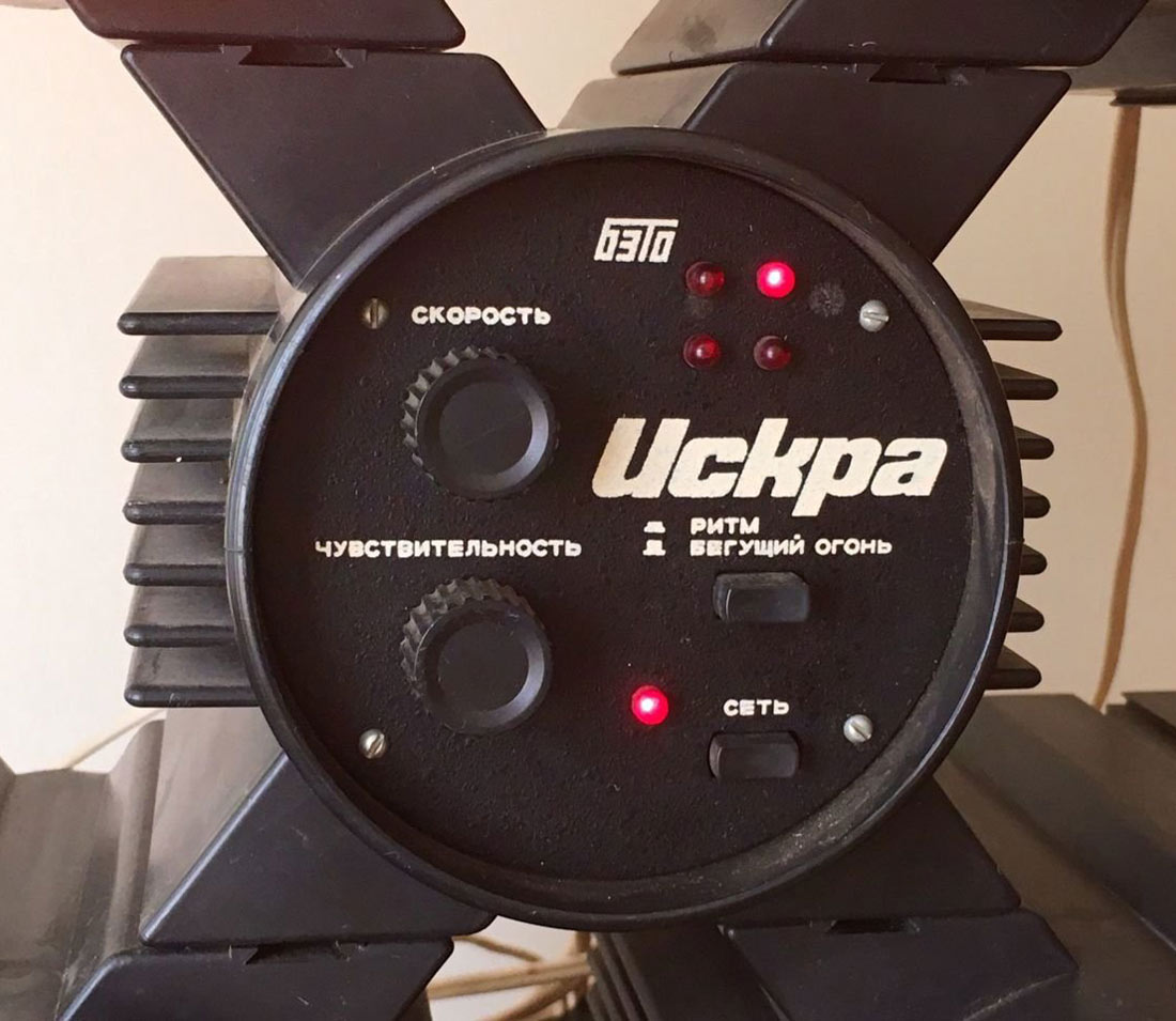Цветомузыкальная приставка *Искра* выпускалась предположительно с 1988 года Уфимским ПО имени С.М.Кирова. Предположительно с 1989 года выпускалась ЦМП *Искра-2* и так же предположительно с 1990 года ЦМП *Искра-2М*. ЦМП представляет собой 8-ми канальное светодинамическое устройство. ЦМП предназначена для обычного (сигналом ЗЧ через встроенный микрофон) или автоматического сопровождения музыкальных фонограмм с помощью эффекта *бегущие огни* с регулируемой скоростью. Питание от сети переменного тока 220 В. Мощность ламп каждого канала 100 Вт. Габариты любого из 9-ти блоков 130 х 140 х 170 мм.