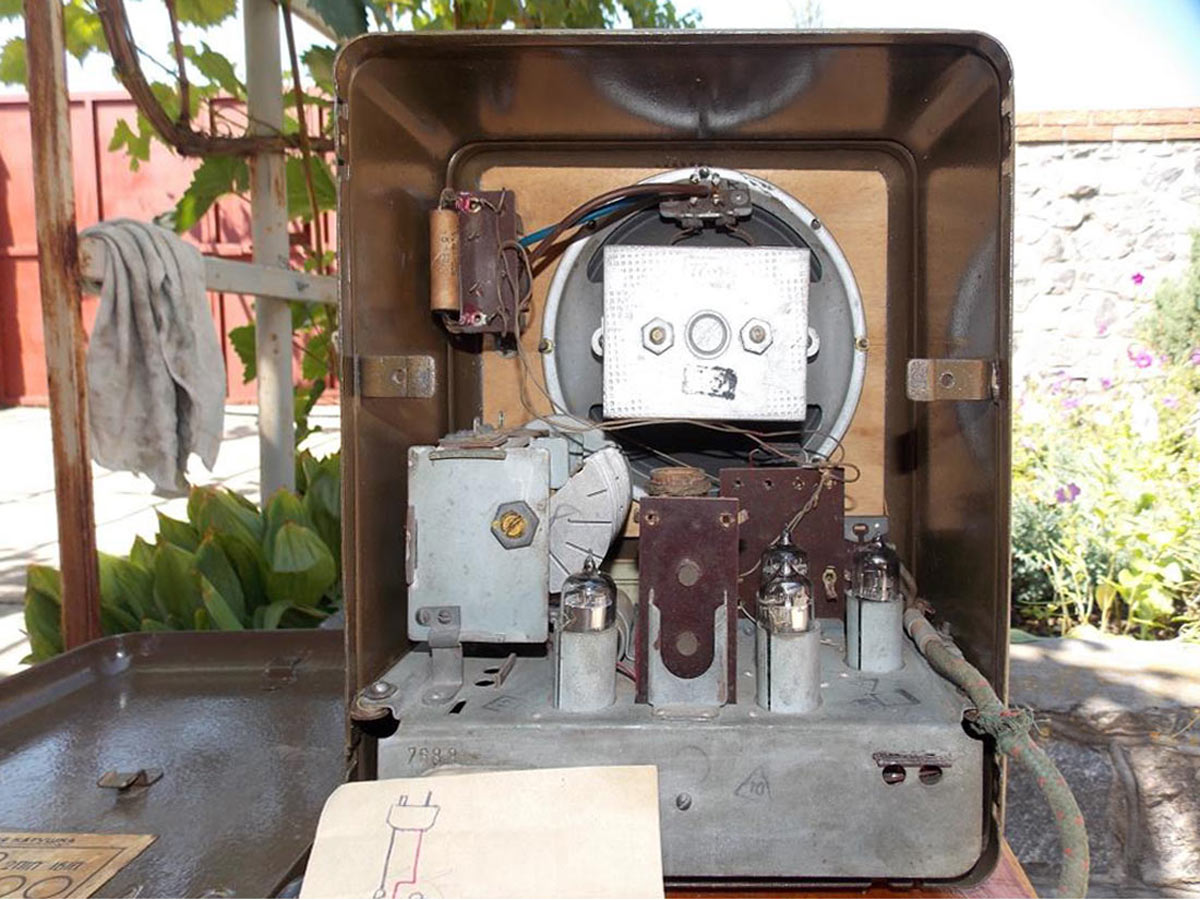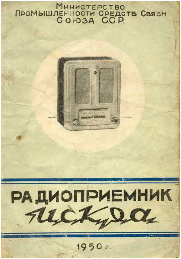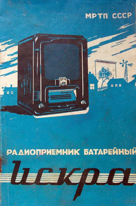 Радиоприёмник батарейный **Искра** разработан и опытно выпущен на Александровском радиозаводе в конце 1949 года, а массово выпускался с 1950 года. В разработке приёмника участвовали конструкторы Свердловского завода автоматики. Основой стал приёмник **АРЗ-49**. **Искра** один из массовых батарейных приёмников. Это четырёхламповый супергетеродин. Диапазоны: ДВ - 2000...730 м и СВ - 580...188 м. Чувствительность 400 мкВ. ПЧ = 110 кГц. Выходная мощность на громкоговорителе 1ГД-2 - 150 мВт. Диапазон воспроизводимых частот 200...3000 Гц. Для питания используются один из двух комплектов батарей. Один на 1000 часов работы с батареей накала БНС-МВД-400, двумя анодно-сеточными батареями ГСГ-60С-8 и облегчённый на 300 часов, с батареей БНС-МВД-95 и двумя 5СГ-60С-2,5. Под шкалой расположен рычажок переключателя диапазонов. Левая ручка - регулятор громкости и выключатель питания. Правая - настройка на радиостанцию. Корпус из листовой штампованной стали. Габариты приёмника 214х260х148 мм. Вес 4,3 кг.