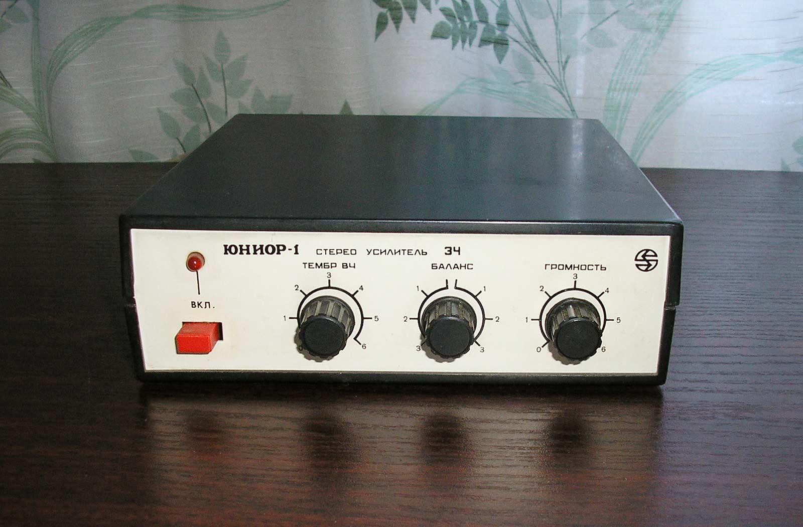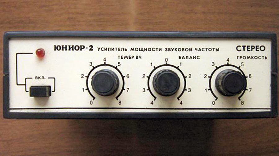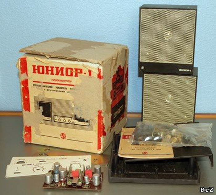 Радиоконструктор *Юниор-1* (Усилитель ЗЧ) с 1989 года выпускал Каменец-Подольский завод *Электроприбор*. Радиоконструктор **Юниор-1** входящий в серию радиоконструкторов **Старт** позволяют собрать малогабаритный стереофонический усилитель ЗЧ, оснащённый АС. Усилитель собран на микросхемах К174УН-7 и обеспечивает выходную мощность до 2 Вт на канал. В каждой из АС используются головки 2ГДШ-1 или 1ГДШ-4. В набор входит корпус усилителя с передней панелью и корпуса АС. Источник питания в набор не входит. Цена РК 25 рублей. Набор усилителя ЗЧ **Юниор-2** выпускаемый с начала 1992 года ничем, кроме розничной цены не отличается от базового набора.