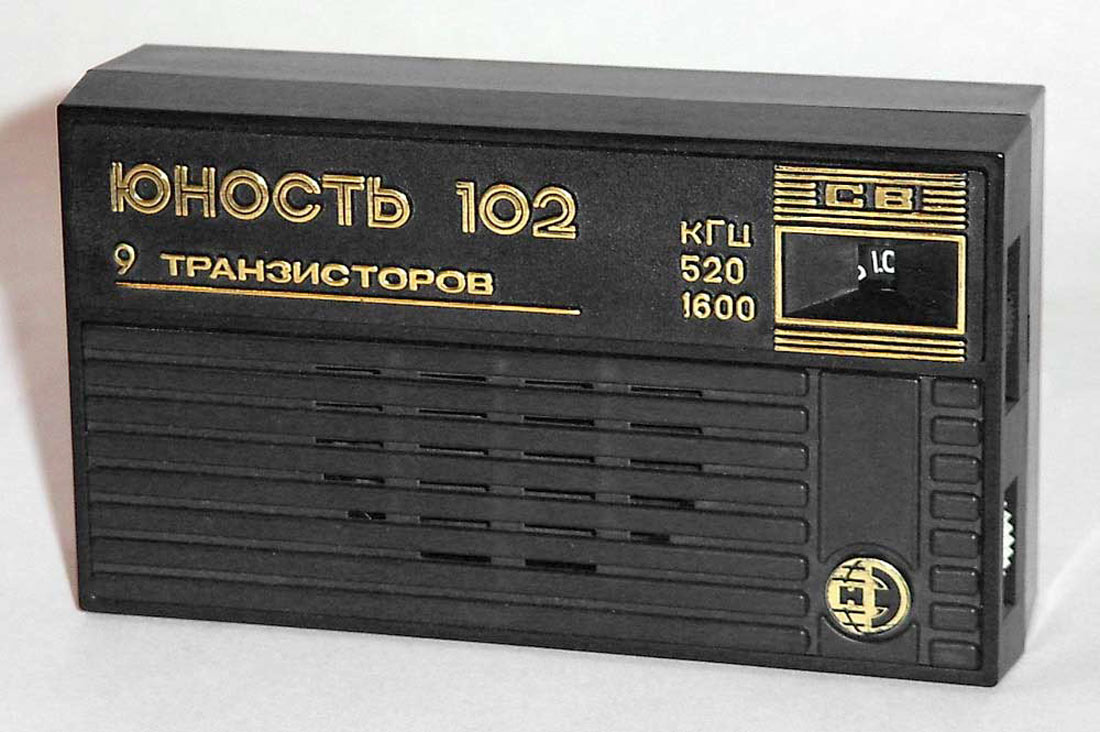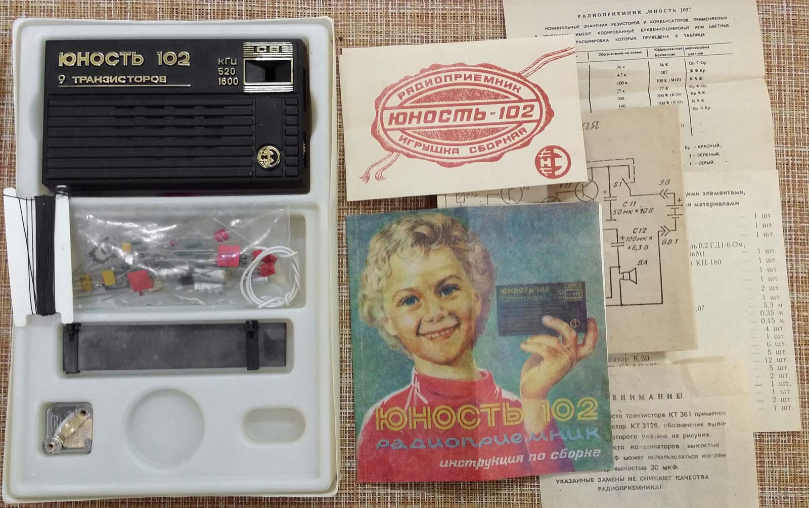 Транзисторный радиоприёмник *Юность-102* из конструктора с 1988 года выпускал 1-й Московский приборостроительный завод. Радиоприёмник предназначен для начинающих радиолюбителей в возрасте от 10 лет. Он представляет собой набор радиодеталей и компонентов, необходимых для сборки радиоприёмника по схеме прямого усиления, работающего в диапазоне СВ. Правильно собранный и настроенный приёмник имеет чувствительность около 10 мВ/м и селективность 5...7 дБ. Номинальная выходная мощность составляет 80 мВт, максимальная 150 мВт. Диапазон воспроизводимых звуковых частот 350...4000 Гц. Цена набора с начала выпуска была 11 рублей, затем с весны 1991 года 19 рублей, уже с осени 1991 года уже 33 рубля. Из-за безостановочной инфляции в стране тех лет, с середины 1992 года набор *Юность-102* был снят с производства.