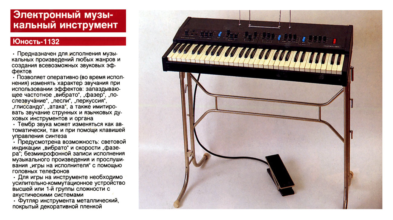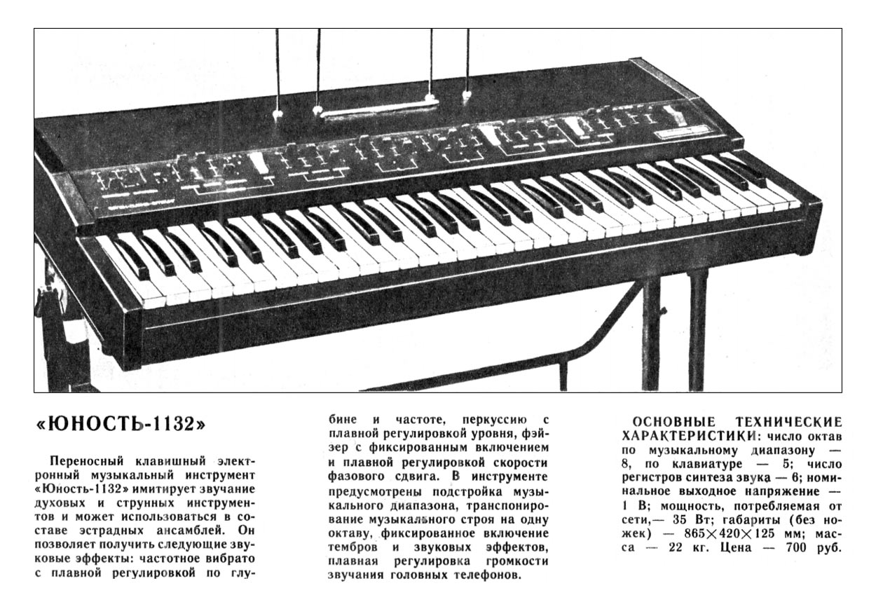 Электромузыкальный инструмент *Юность-1132* с 1987 года выпускал Муромский завод РИП (Радио Измерительных Приборов). ЭМИ иммитирует звучание духовых и струнных инструментов и может быть использован в составе эстрадных ансамблей. Он позволяет получить такие эффекты как: частотное вибрато с плавной регулировкой по глубине и частоте; перкуссию с плавной регулировкой уровня сигнала; фэйзер с фиксированным включением и плавной регулировкой скорости фазового сдвига. В инструменте предусмотрены: подстройка музыкального диапазона; транспонирование музыкального строя на одну октаву; фиксированное включение тембров и эффектов; плавная регулировка громкости звучания головных телефонов. Основные технические характеристики: число октав по музыкальному диапазону - 8; по клавиатуре - 5; число регистров синтеза звука - 6; номинальное выходное напряжение - 1 В; потребляемая мощность 35 Вт. Габариты ЭМИ (без ножек) 865х420х125 мм. Вес 22 кг.
