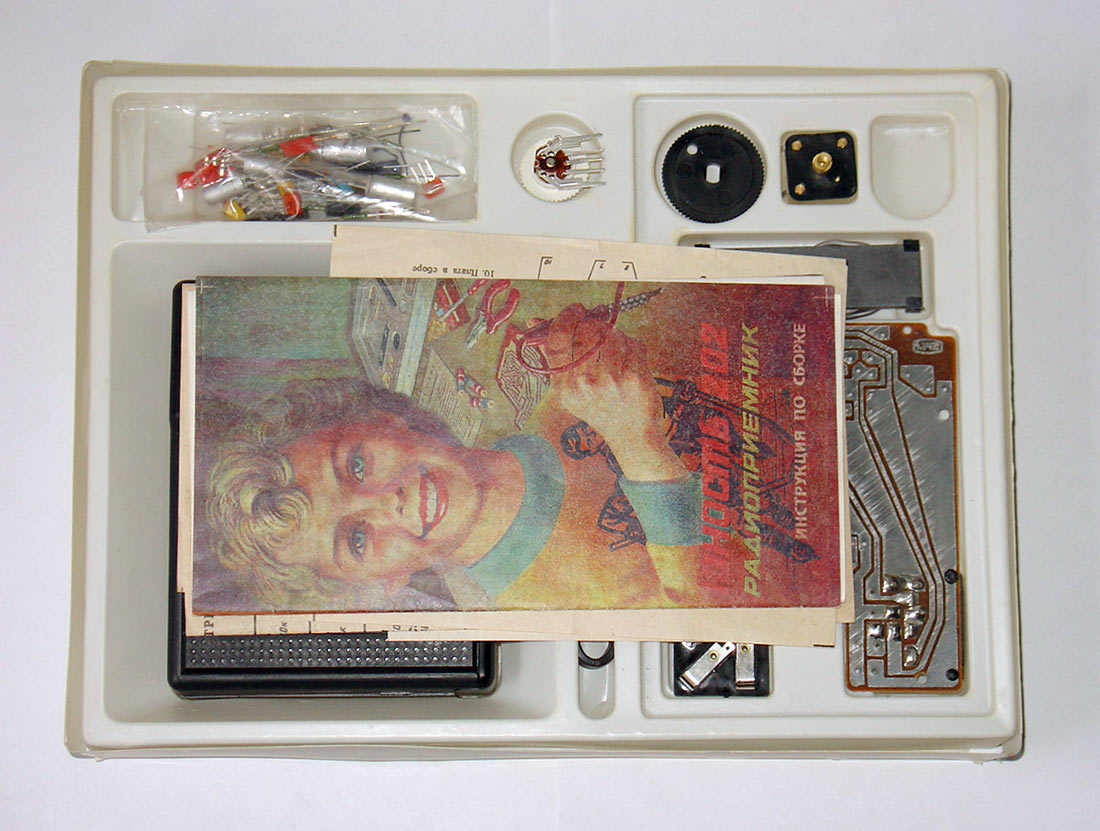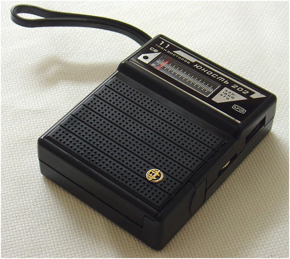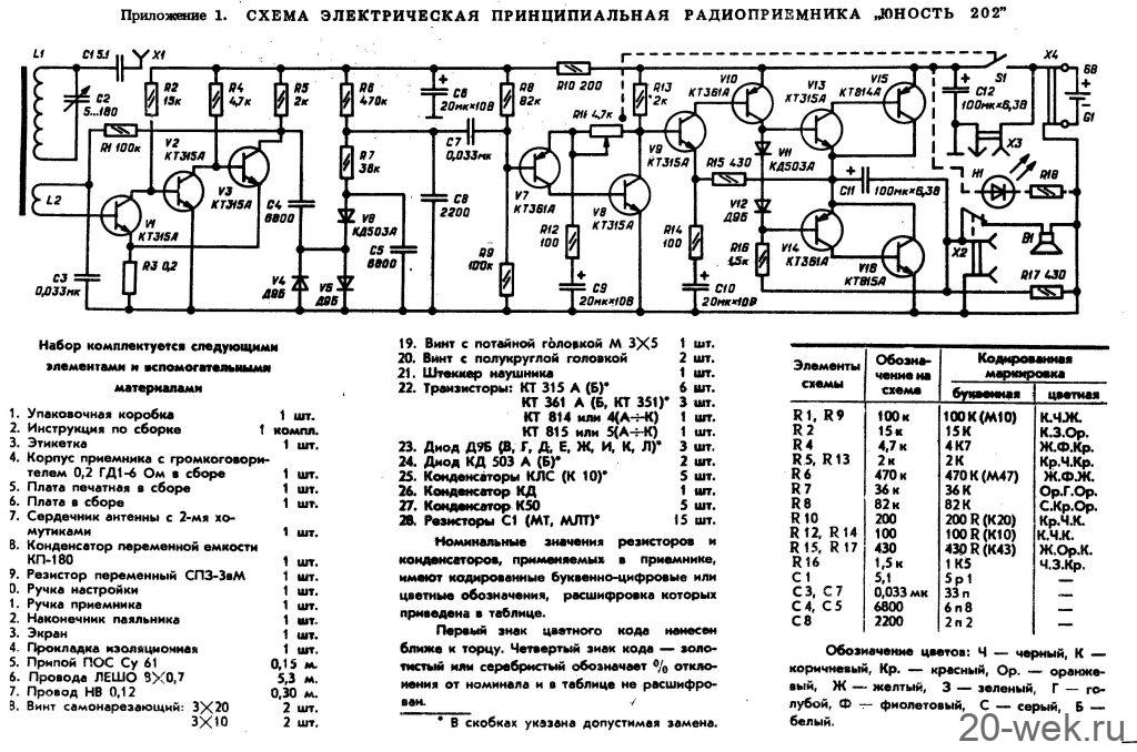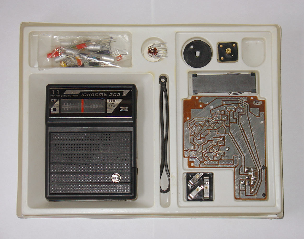 Детский радиоприёмник *Юность-202* из набора радиоконструктора с 1988 года выпускал Первый московский приборостроительный завод. Истрия модели: Это самый интересный конструктор выпускавшийся в СССР. Дело в том, что автором схемы этого приемника обыкновенный читатель журнала Радио, а схема родилась в результате объявленного конкурса на улучшение/модернизацию предыдущей модели конструктора "Юность-105". По результатам конкурса была выбрана схема одного из читателей журнала Радио, В.Верютина и эта схема и пошла в серию. Примечательно, что в журнале была опубликована схема на транзисторах КТ315Б, а серию пошла модель с транзисторами КТ315А, и это было не лучшим решением, приемник часто возбуждался при работе с подсевшими элементами питания. Схема из журнала Радио (№12/1987) Схема из набора конструктора: Всю историю о конструкторе можно почитать в статье. Набор-конструктор позволяет из радиодеталей, элементов, узлов, печатной платы и футляра собрать высокочувствительный радиоприёмник, работающий в диапазоне средних волн 520...1600 кГц. Чувствительность собранного и настроенного приёмника около 5 мВ/м. Номинальная выходная мощность 120 мВт, максимальная 250 мВт. Питание - 4 элемента АА. Ток покоя 10 мА. Диапазон воспроизводимых звуковых частот 300...4000 Гц. Первоначальная цена набора была 14 рублей, с осени 1991 года 22 рубля 50 копеек. С 1992 года выпуск набора радиоконструктора *Юность-202* в связи с усилившейся инфляцией был прекращён.