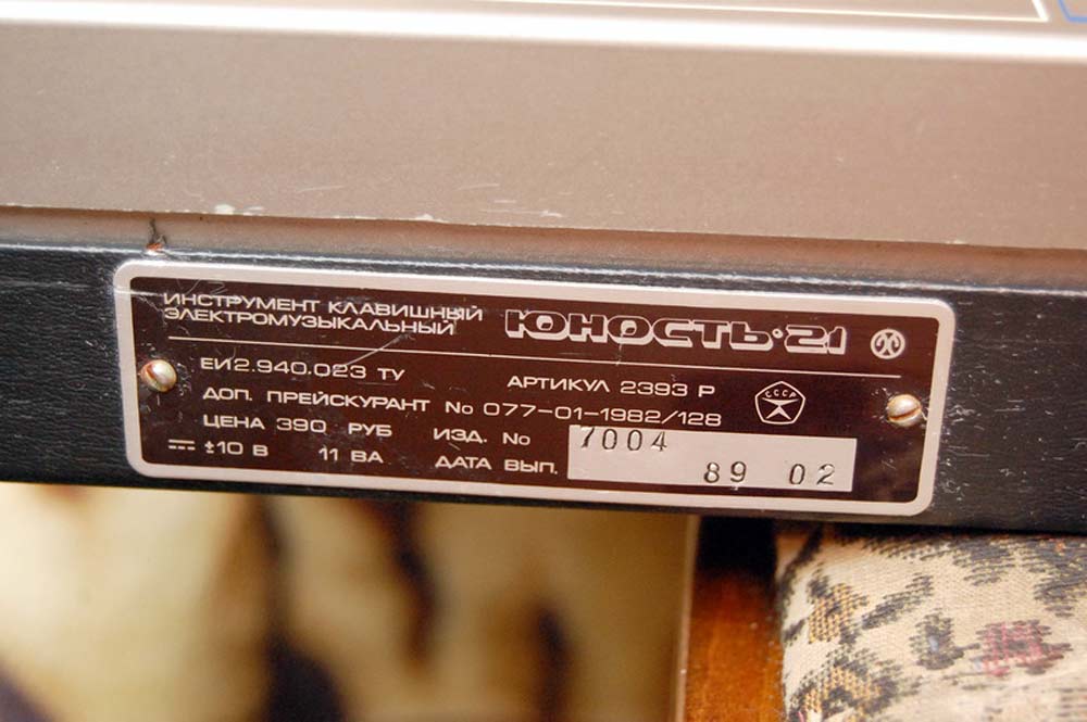 Электронный синтезатор *Юность-21* (Стринг) выпускал с 1986 года Муромский завод радиоизмерительных приборов. Синтезатор предназначен для исполнения различных музыкальных произведений в составе эстрадных оркестров. Имитирует звучание хора и струнных инструментов (контрабаса, виолончели, скрипки и др.). Задающий генератор синтезатора позволяет смещать музыкальный строй на октаву. Основные технические характеристики: музыкальный диапазон 6 октав; объём клавиатуры 4 октавы; число тембровых регистров 3; напряжение ЗЧ на выходе инструмента 0,25 В; потребляемая мощность 6 Вт; габариты 720х220х55 мм; вес 6 кг.