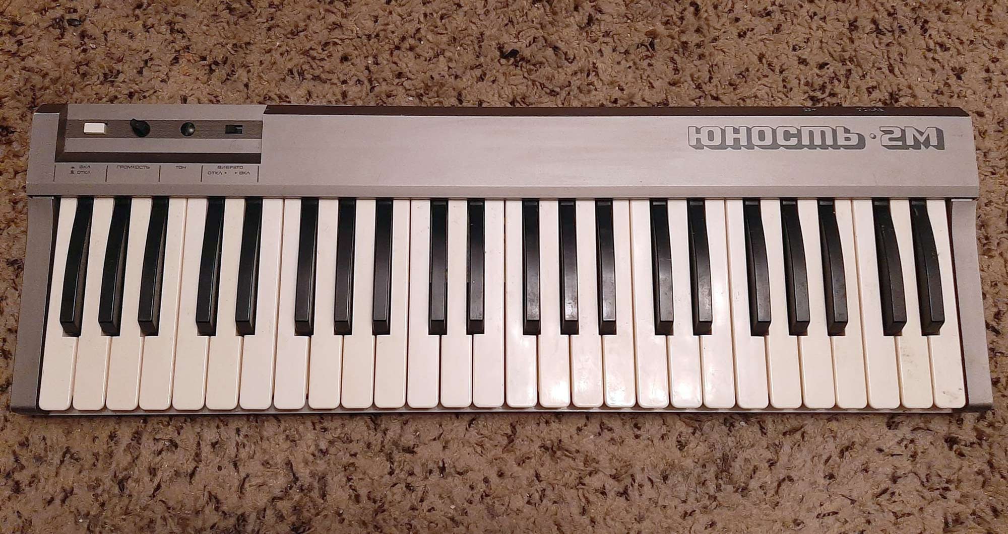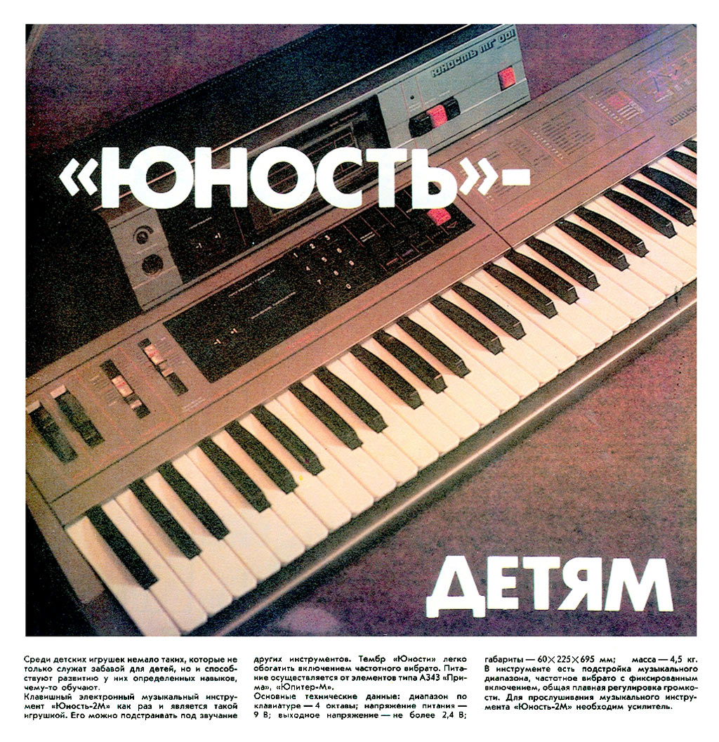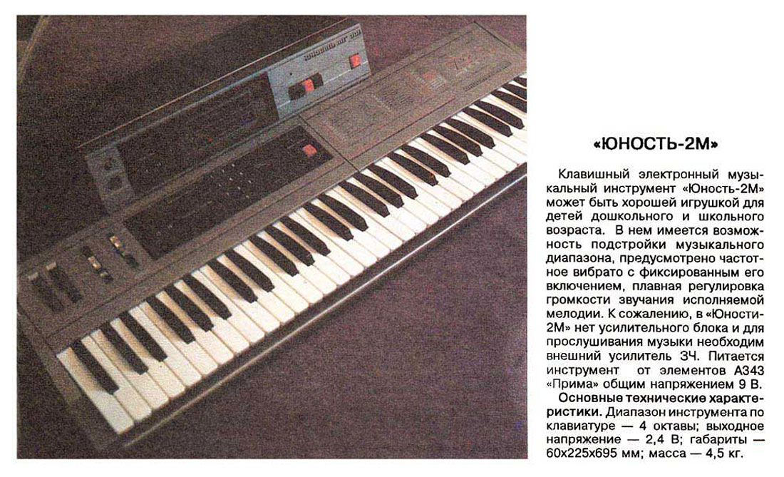 Электронный музыкальный инструмент *Юность-2М* выпускался с 1990 года. Клавишный электронный музыкальный инструмент *Юность-2М* может быть хорошей игрушкой для детей дошкольного и школьного возраста. В нём имеется возможность для подстройки музыкального диапазона, предусмотрено частотное вибрато с фиксированным его включением, плавная регулировка громкости звучания исполняемой мелодии. В ЭМИ нет усилительного блока и для прослушивания музыки необходим внешний усилитель ЗЧ с АС. Питается инструмент от шести элементов А-343, общим напряжением 9 В. Основные технические характеристики. Диапазон инструмента по клавиатуре 4 октавы; выходное напряжение 2,4 В; габариты ЭМИ - 60x225x695 мм; его масса 4,5 кг.