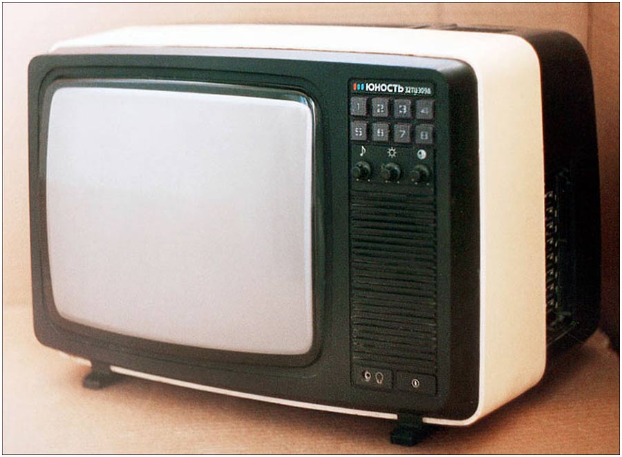 Телевизор цветного изображения *Юность 32ТЦ-309/Д* с 1989 года выпускали Московский радиотехнический завод, а с 1992 года и Пензенский радиозавод. **Юность 32ТЦ-309/Д** - это унифицированный телевизор для приёма программ цветного изображения и звукового сопровождения в диапазонах МВ или МВ и ДМВ. Конструкция аппарата кассетно-модульная с модулями повышенной функциональности. В качестве несущей конструкции используется непосредственно сам корпус телевизора, который изготовлен из ударопрочной пластмассы. В телевизоре применен взрывозащищенный кинескоп 32ЛК2Ц с размером экрана по диагонали 32 см и углом отклонения электронных лучей 90°. Размер изображения 182х244 мм. Чувствительность ограниченная синхронизацией в MB/ДМВ диапазонах 40/70 мкВ. Разрешающая способность по горизонтали 350 линий. Номинальная выходная мощность канала звука 0,5 Вт. Питание телевизора осуществляется от сети переменного тока напряжением 220 В. Потребляемая от сети мощность 60 Вт. Габариты телевизора - 288 х 420 х 362 мм. Масса 12,5 кг.