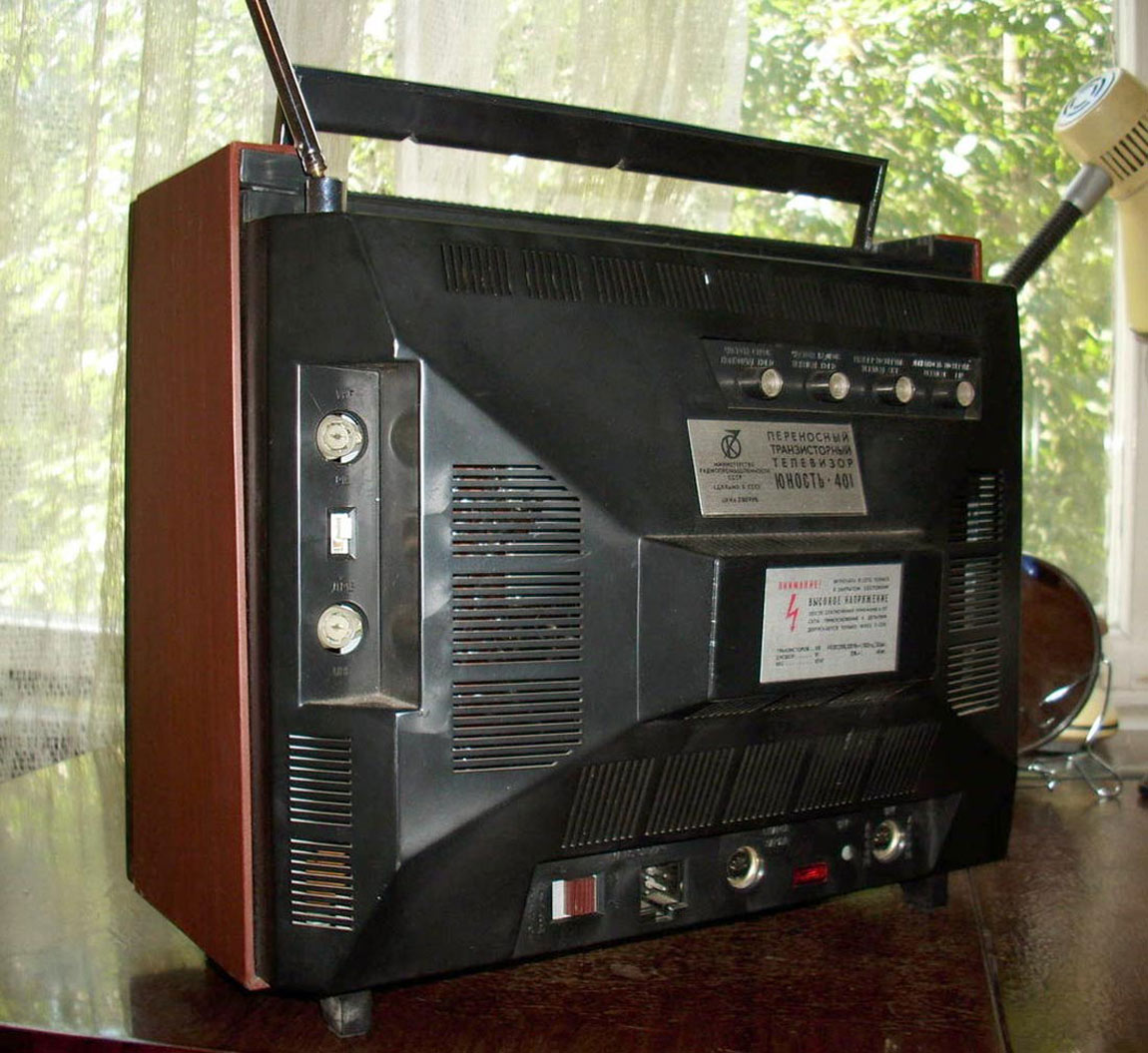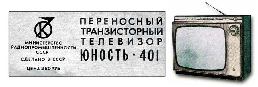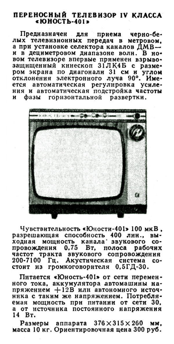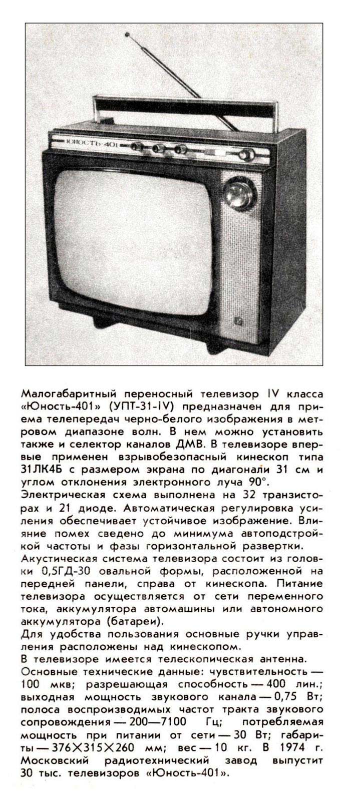 Телевизионный приёмник ч/б изображения *Юность-401/Д* с 1972 года выпускал Московский радиотехнический завод. Переносной телевизор 4 класса **Юность-401** (ПТ-31-IV-1) предназначен для приёма телевизионных программ в МВ, а при установке селектора каналов СКД-20 и в ДМВ диапазоне. Телевизор **Юность-401Д** уже имеет блок СКД-20. Телевизор обеспечивает приём програм на расстоянии до 100 км от телестудии. В нём применён кинескоп 31ЛК4Б, с углом отклонения луча 90°. В схеме аппарата имеется АРУ и АПЧ и Ф. Чувствительность телевизора 100 мкВ. Чёткость в центре экрана 400 линий. Номинальная выходная мощность - 0,75 Вт. Полоса воспроизводимых звуковых частот - 200...7100 Гц. АС состоит из громкоговорителя 0,5ГД-30, есть гнездо для головных телефонов с отключением АС. Питается телевизор от сети, аккумулятора или источника, напряжением 12 вольт. Потребляемая мощность при питании от сети 30 Вт, источника постоянного тока 14 Вт. Футляр из пластмассы, отделан плёнкой под ценные породы дерева с металлизацией. Габариты телевизора - 376 х 315 х 260 мм. Масса 10 кг. Цена модели 280 рублей.