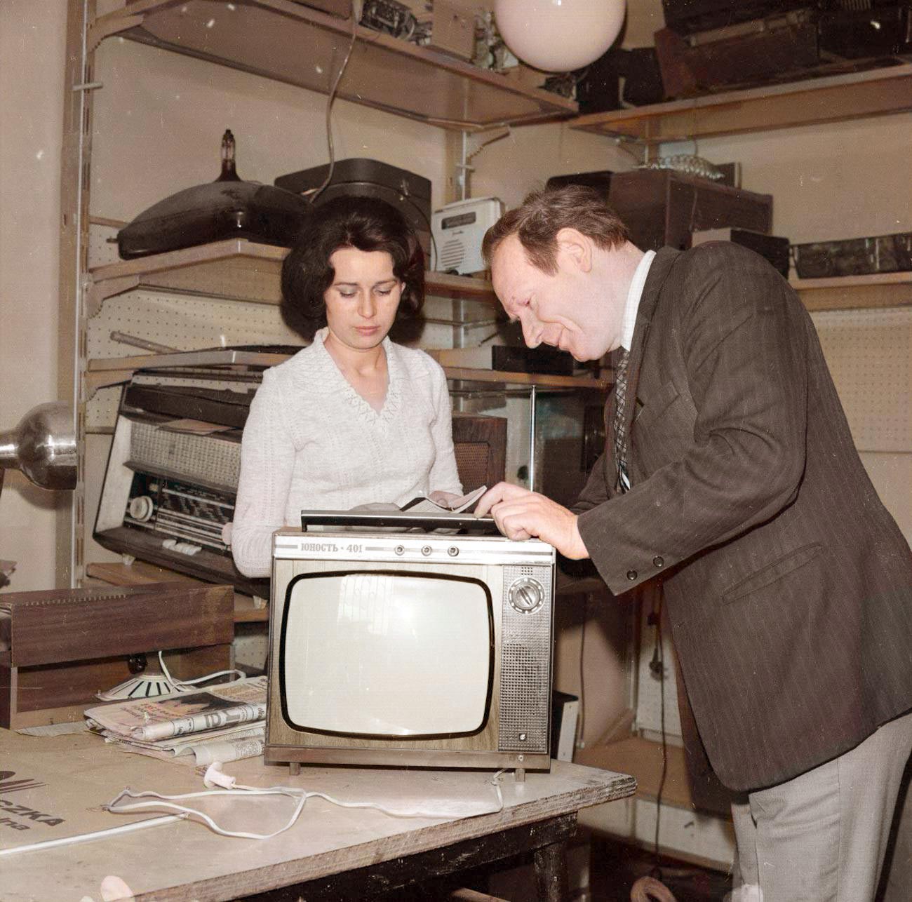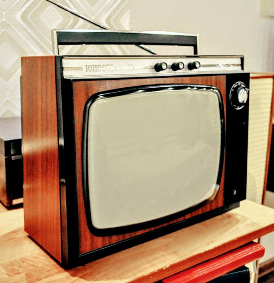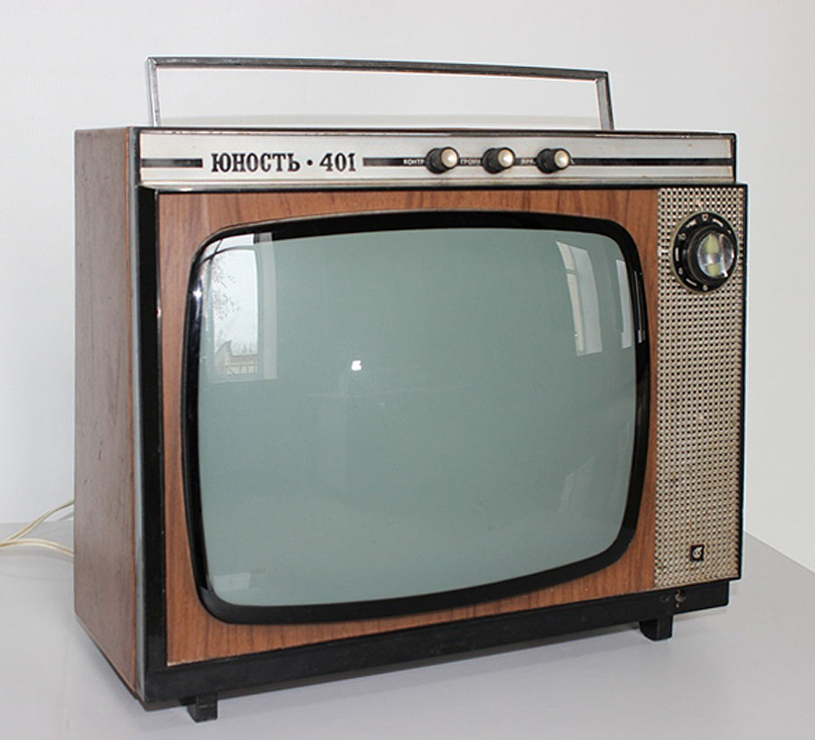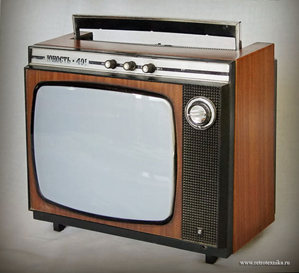Телевизионный приёмник ч/б изображения *Юность-401/Д* с 1972 года выпускал Московский радиотехнический завод. Переносной телевизор 4 класса **Юность-401** (ПТ-31-IV-1) предназначен для приёма телевизионных программ в МВ, а при установке селектора каналов СКД-20 и в ДМВ диапазоне. Телевизор **Юность-401Д** уже имеет блок СКД-20. Телевизор обеспечивает приём програм на расстоянии до 100 км от телестудии. В нём применён кинескоп 31ЛК4Б, с углом отклонения луча 90°. В схеме аппарата имеется АРУ и АПЧ и Ф. Чувствительность телевизора 100 мкВ. Чёткость в центре экрана 400 линий. Номинальная выходная мощность - 0,75 Вт. Полоса воспроизводимых звуковых частот - 200...7100 Гц. АС состоит из громкоговорителя 0,5ГД-30, есть гнездо для головных телефонов с отключением АС. Питается телевизор от сети, аккумулятора или источника, напряжением 12 вольт. Потребляемая мощность при питании от сети 30 Вт, источника постоянного тока 14 Вт. Футляр из пластмассы, отделан плёнкой под ценные породы дерева с металлизацией. Габариты телевизора - 376 х 315 х 260 мм. Масса 10 кг. Цена модели 280 рублей.