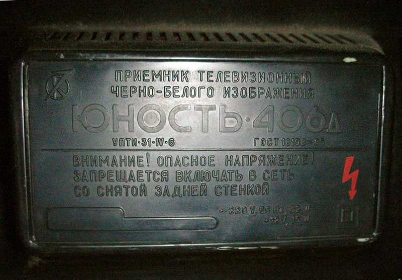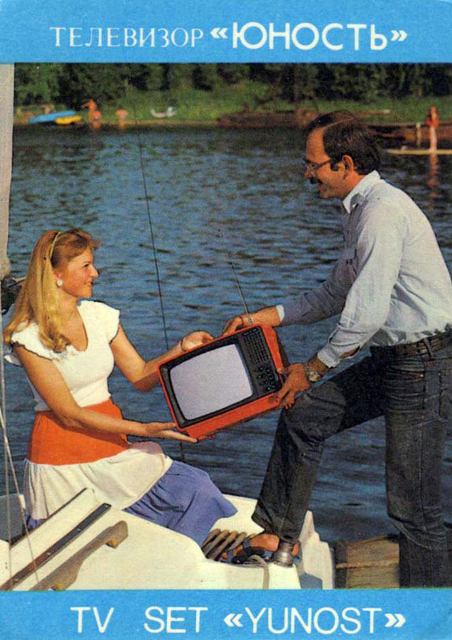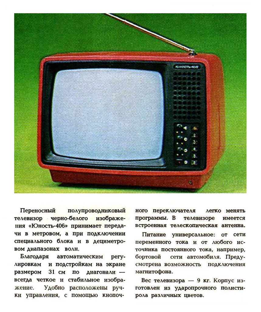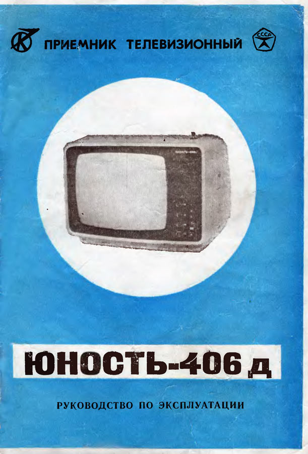 Телевизионный приёмник *Юность-406/Д* с 1987 года выпускал Московский радиотехнический завод. Переносной унифицированный телевизор **Юность-406/Д** (УПТИ-31-IV-7/6) предназначен для работы в МВ или в МВ и ДМВ диапазоне. В ТВ имеется ряд автоматических регулировок, обеспечивающих высококачественное изображение. В телевизоре применён взрывобезопасный кинескоп 31ЛК4Б с углом отклонения луча 90°, селектор каналов МВ диапазона *СК-М-23*, селектор каналов ДМВ диапазона *СК-Д-22*, 6-кнопочный переключатель для выбора программ. Предусмотрена возможность подключения магнитофона для записи звука передач, прослушивания его на телефоны. ТВ имеет встроенную телескопическую антенну для приёма передач ДМВ диапазона, имеется и рамочная антенна. Питание от сети переменного тока или источника постоянного тока 12 В. Футляр телевизора изготовлен из ударопрочного полистирола в разнообразных вариантах цветового сочетания. Размер изображения 202х254 мм. Чувствительность в диапазонах МВ 55 мкВ, ДМВ 90 мкВ. Диапазон воспроизводимых звуковых частот 250...7100 Гц. Номинальная выходная мощность канала звука 0,5 Вт. Потребляемая мощность от постоянного тока 17 Вт от сети 33 Вт. Габариты телевизора 307х392х305 мм. Масса 9 кг. Небольшая партия телевизоров имела 8-кнопочный селектор для выбора телевизионных программ в МВ и ДМВ.