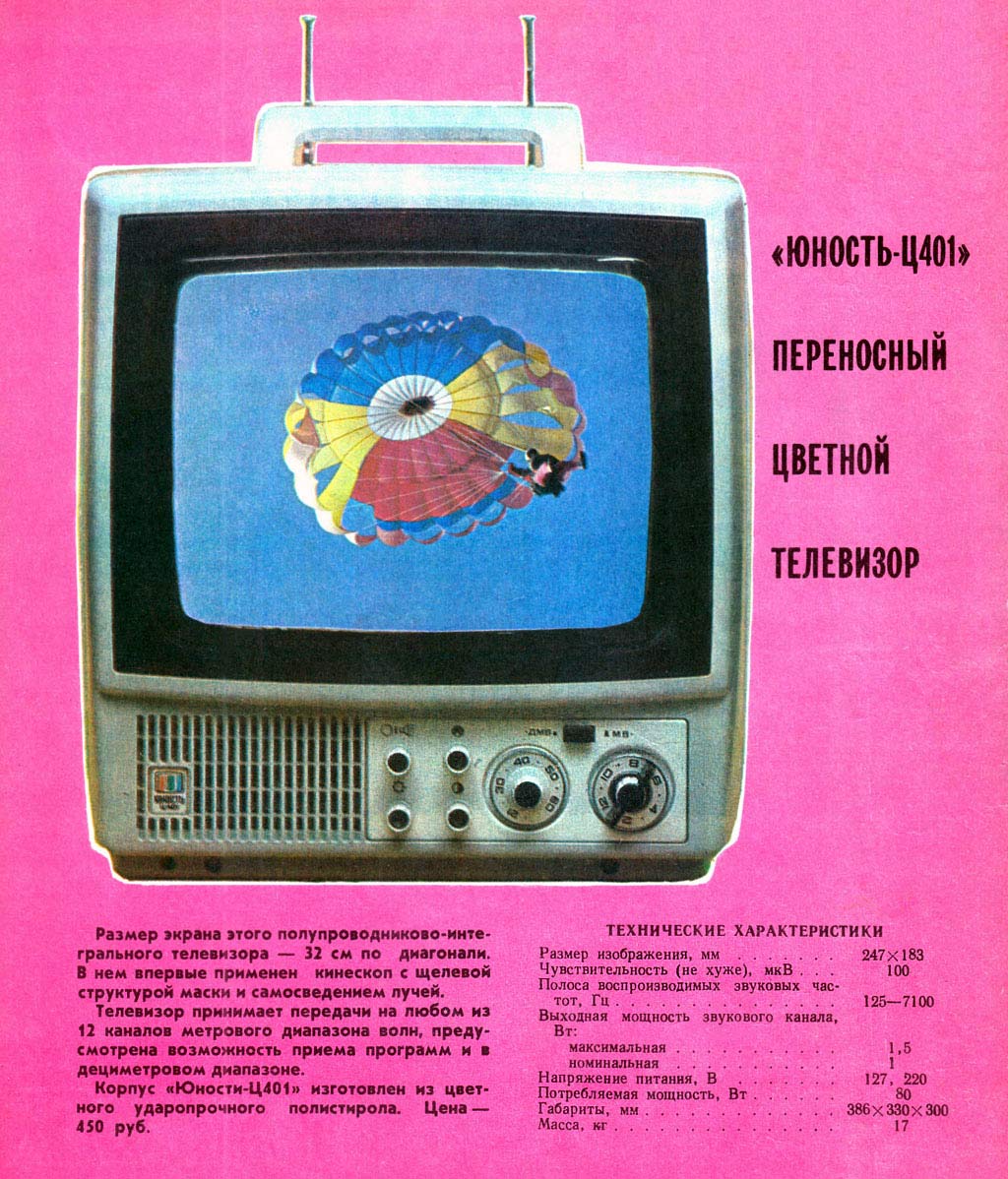 Малогабаритный цветной телевизор *Юность Ц-401* с 1978 года выпускал Московский радиотехнический завод. Полупроводниково-интегральный телевизор **Юность Ц-401** имеет кинескоп с диагональю 32 см. со щелевой маской и самосведением лучей. Телевизор работает на любом из 12-ти каналов МВ, а при установке блока СКД и ДМВ. Чувствительность 100 мкВ. Полоса воспроизводимых частот 250...7100 Гц. Номинальная выходная мощность 1 Вт. Питание от сети 220 В или аккумулятора. Потребляемая от сети мощность 80 Вт. Габариты телевизора 386х330х300 мм. Вес 17 кг. По такой же конструкции, схеме и оформлению Московский электроламповый завод с осени 1978 года выпускал телевизоры **Электроника Ц-401**.